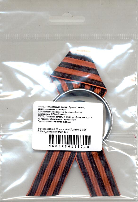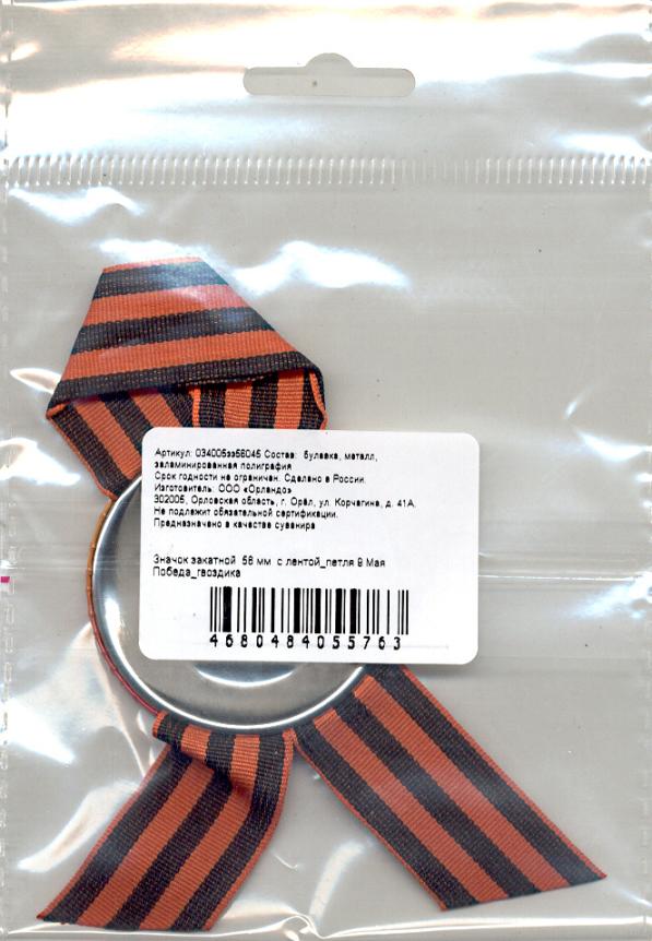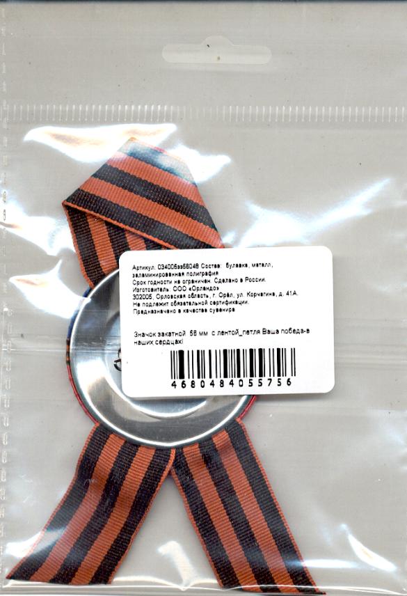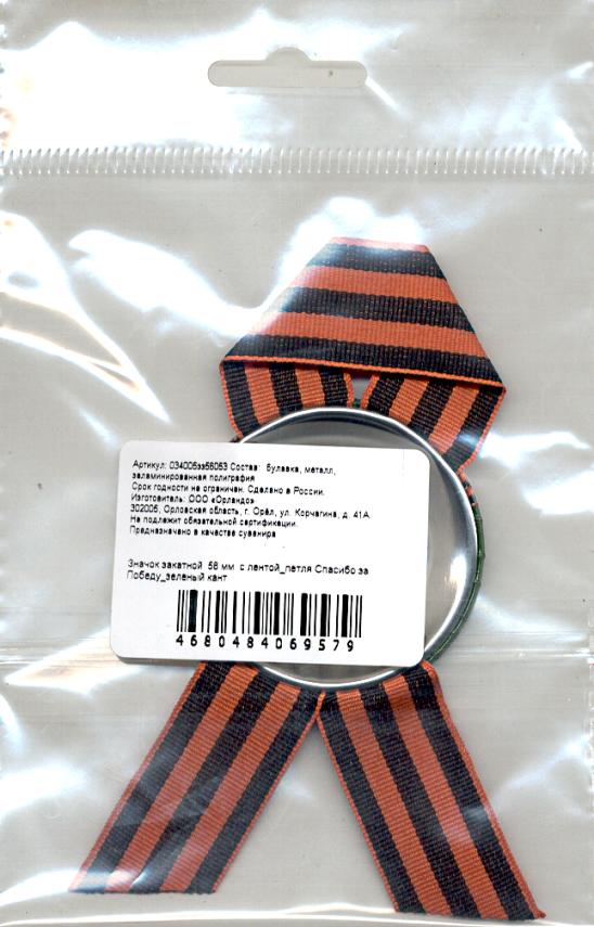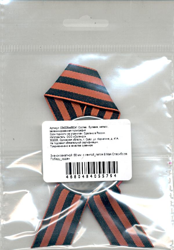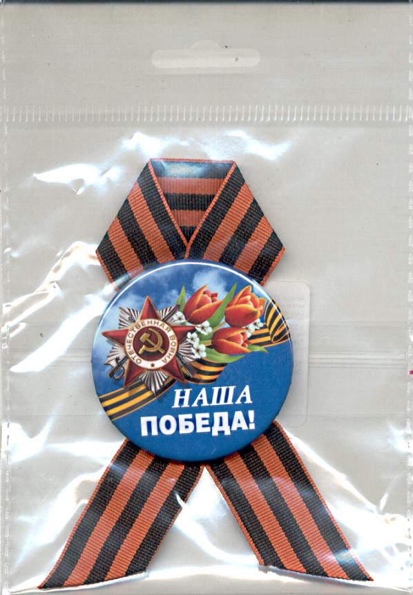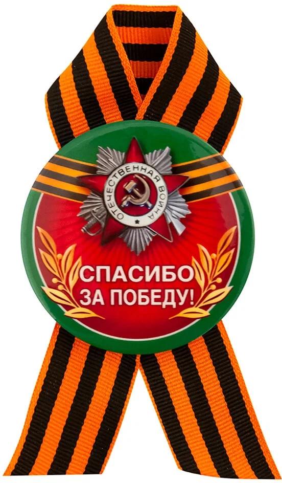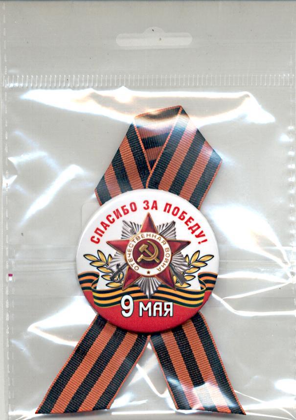 | 9 МАЯ (ДЕНЬ ПОБЕДЫ) Значок с георгиевской лентой металлический ОРЛ закатной 56мм "Спасибо за Победу" (п/упаковка с европодвесом)  Размер значка с георгиевской лентой 12*5,6*0,6 см Значок на 9 мая с георгиевской лентой выполнена из очень качественного, плотного материала. Все детали на Георгиевской ленте выполнены аккуратно, смотрятся потрясающе. В период Великой Отечественной войны полоски на ленте воспринимали как цвета пороха и огня. Но во все времена этот символ ассоциировался с мужеством, героизмом и победой. Каждый год 9 мая мы крепим Георгиевские ленточки, чтобы проявить уважение к воинам и показать, что память об их подвиге жива. Носите Георгиевскую ленту всей семьей на праздничные шествия и мероприятия в честь 9 Мая. |