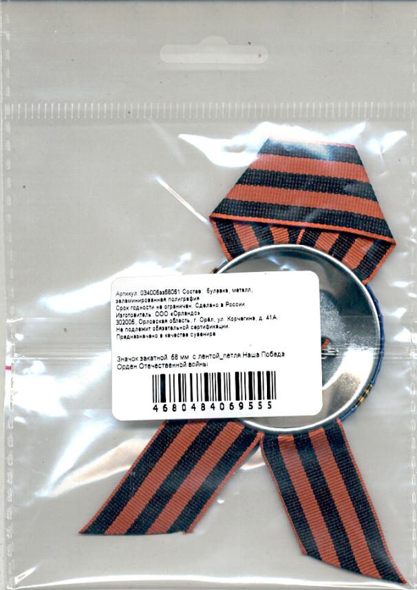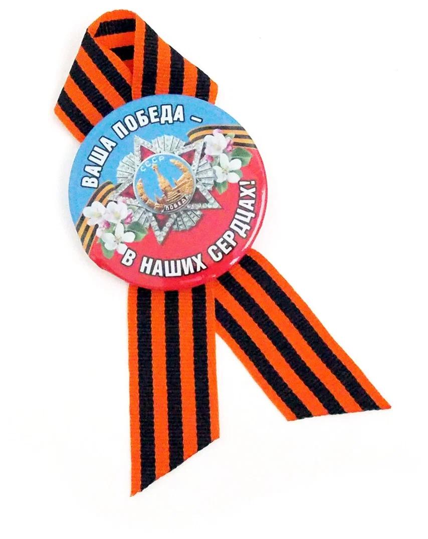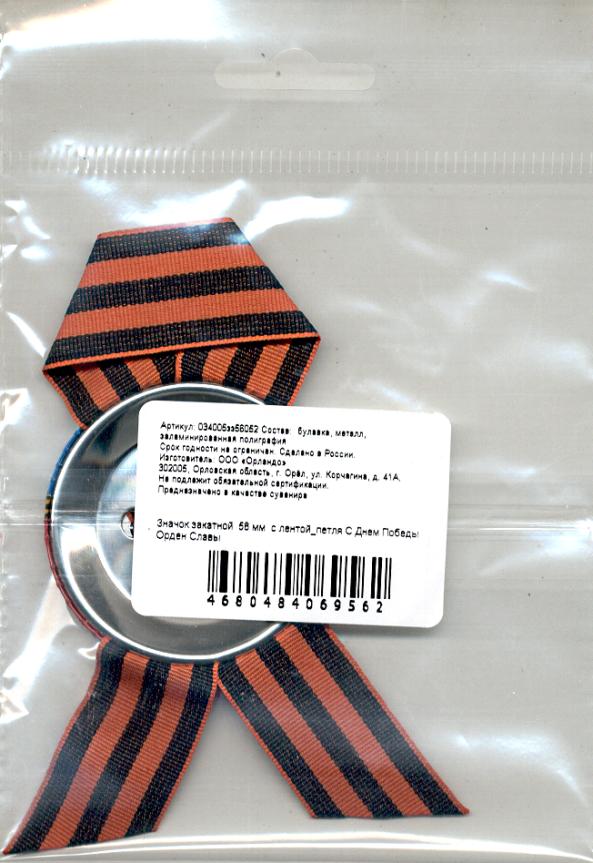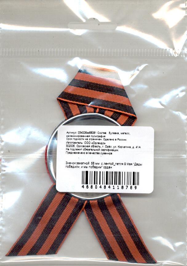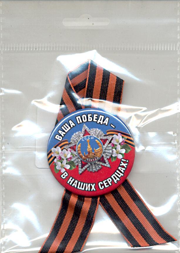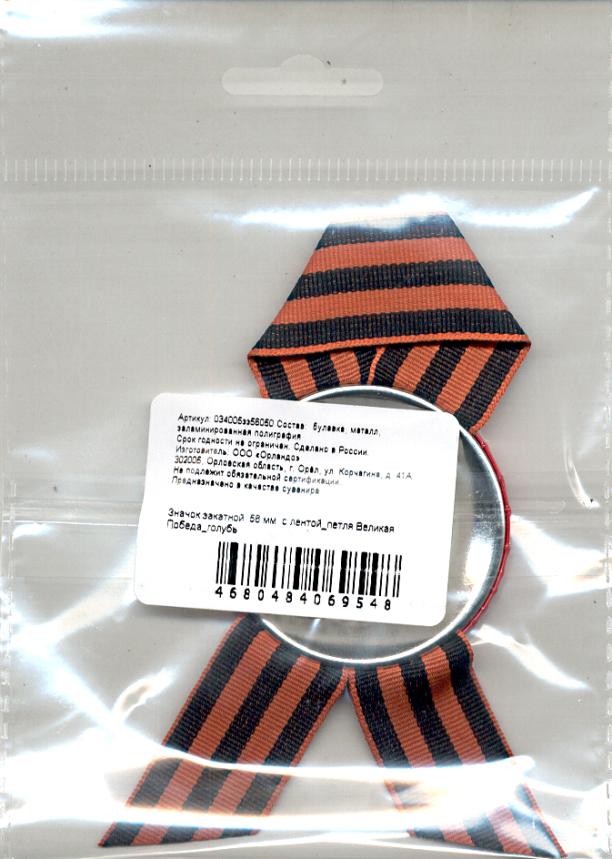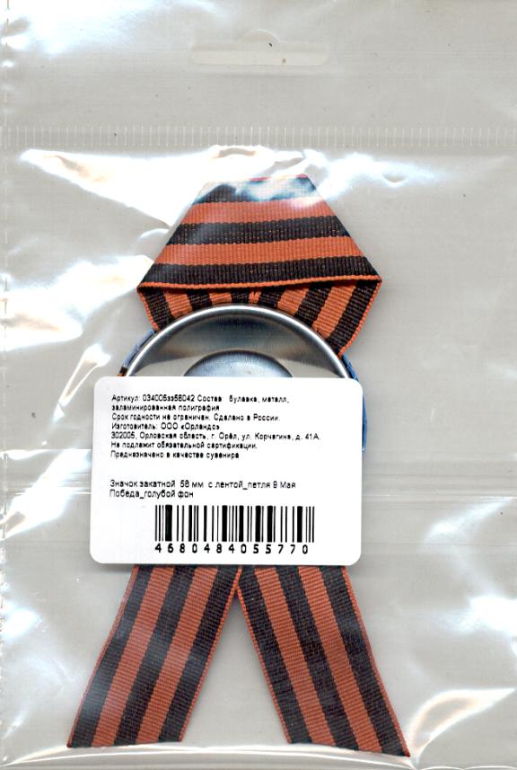 | 9 МАЯ (ДЕНЬ ПОБЕДЫ) Значок с георгиевской лентой металлический ОРЛ закатной 56мм "Спасибо за Победу" (п/упаковка с европодвесом)  Размер значка с георгиевской лентой 12*5,6*0,6 см Значок на 9 мая с георгиевской лентой выполнена из очень качественного, плотного материала. Все детали на Георгиевской ленте выполнены аккуратно, смотрятся потрясающе. В период Великой Отечественной войны полоски на ленте воспринимали как цвета пороха и огня. Но во все времена этот символ ассоциировался с мужеством, героизмом и победой. Каждый год 9 мая мы крепим Георгиевские ленточки, чтобы проявить уважение к воинам и показать, что память об их подвиге жива. Носите Георгиевскую ленту всей семьей на праздничные шествия и мероприятия в честь 9 Мая. |