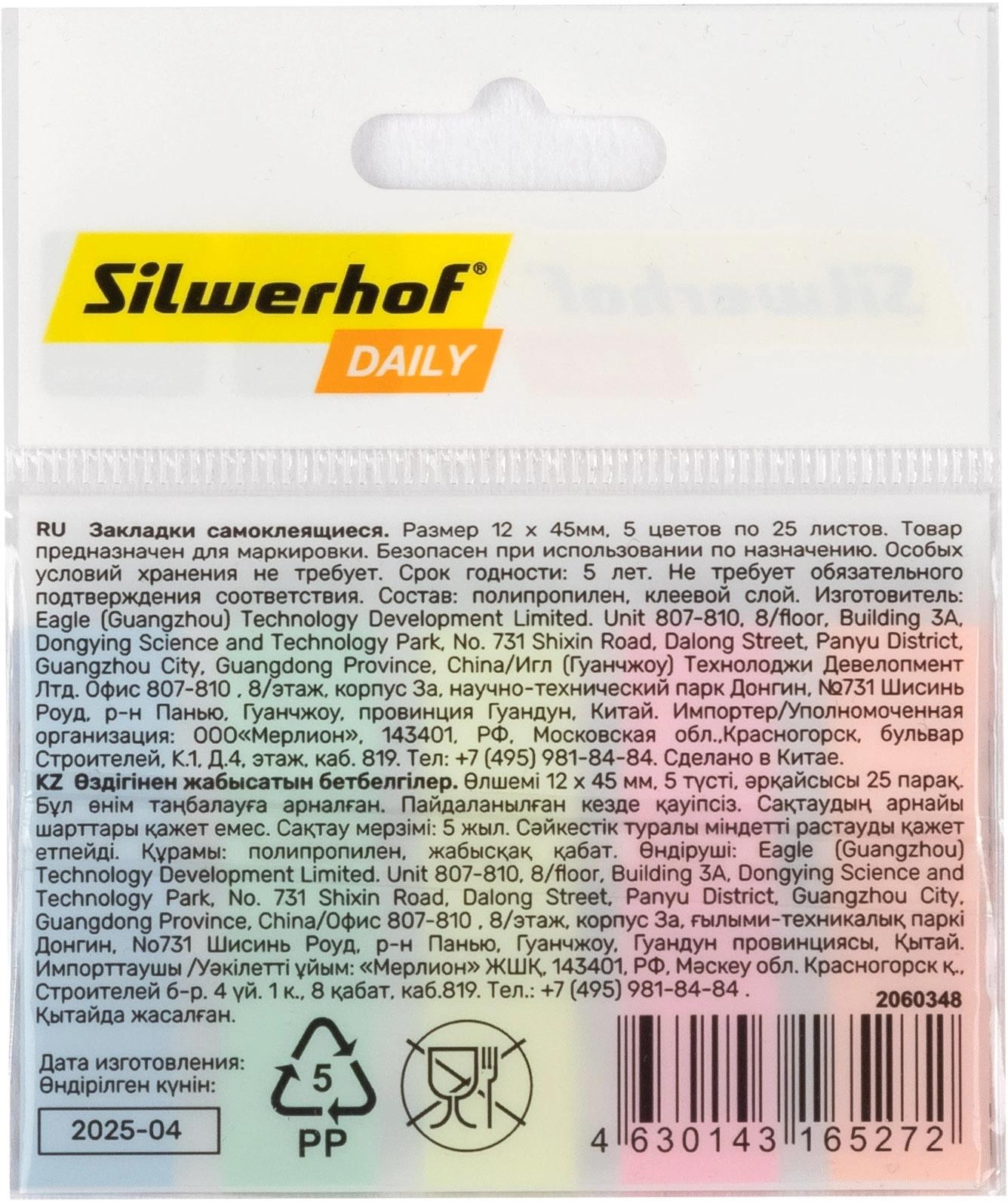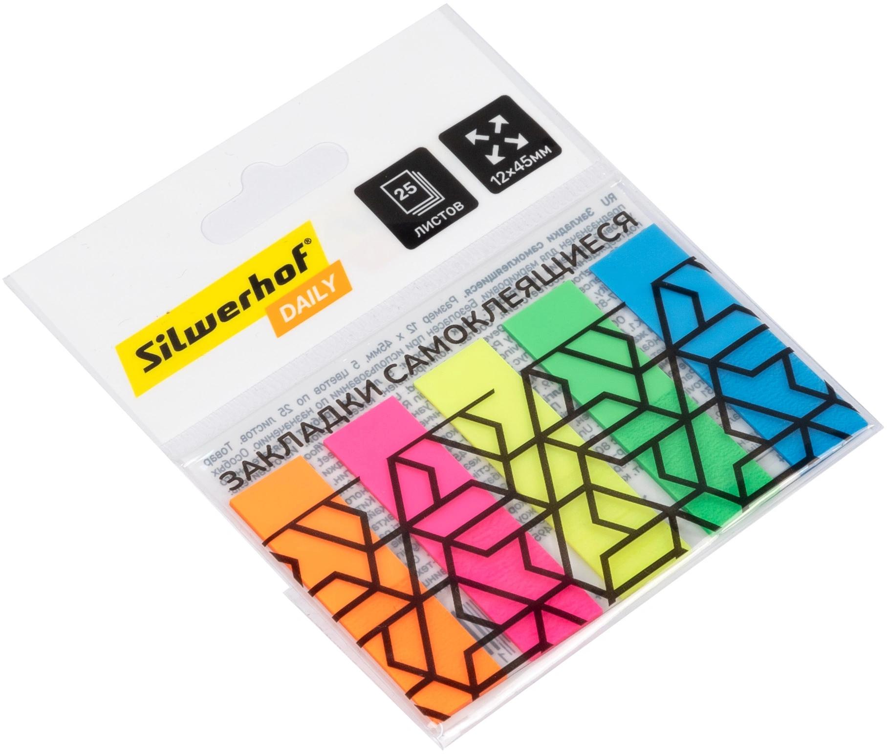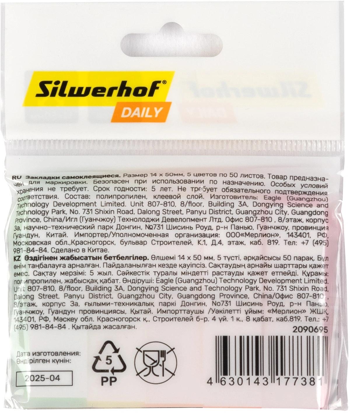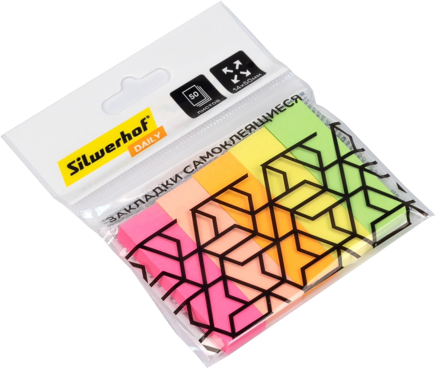 Закладки бумажные (липкий блок с клеевым краем) 50*14 SILWERHOF Daily 5цв*50л (п/упаковка с европодвесом)  Закладки с клеевым краем предназначены для временных пометок страниц. На закладках можно делать надписи. Специальный клеевой состав позволяет надежно крепить и многократно переклеивать закладки, не оставляя следов и не повреждая поверхность. |