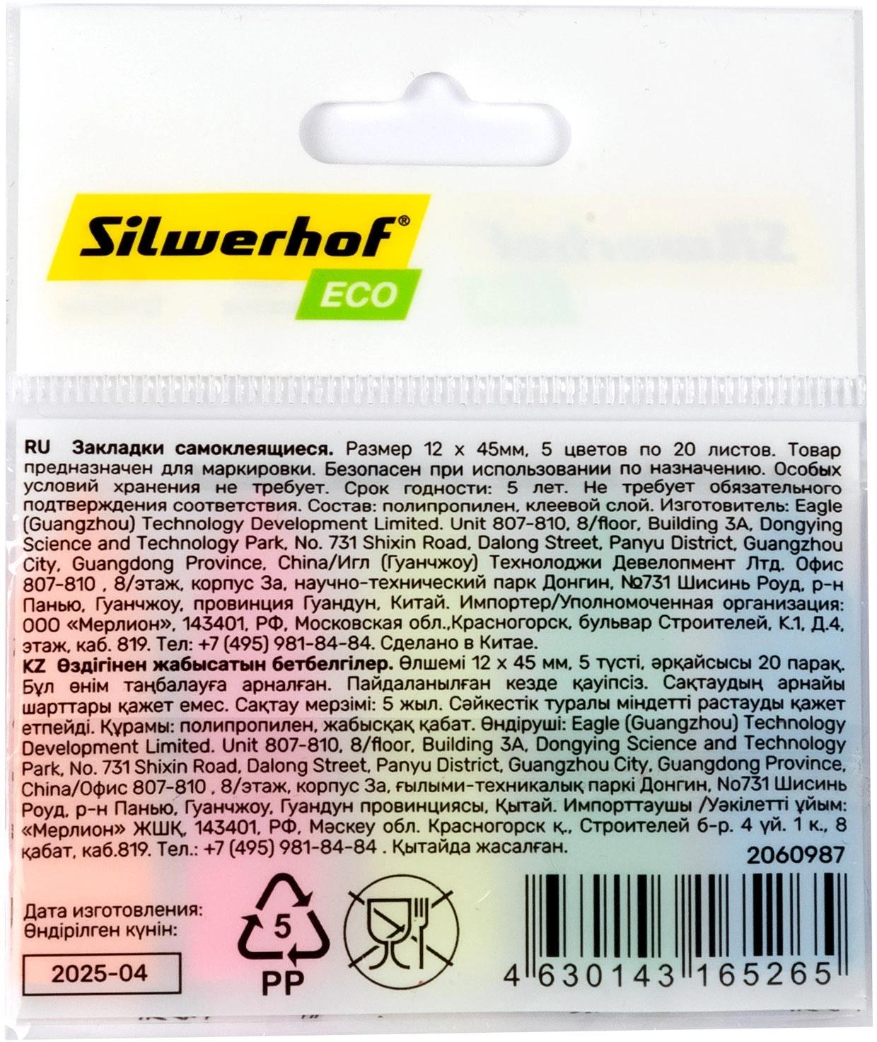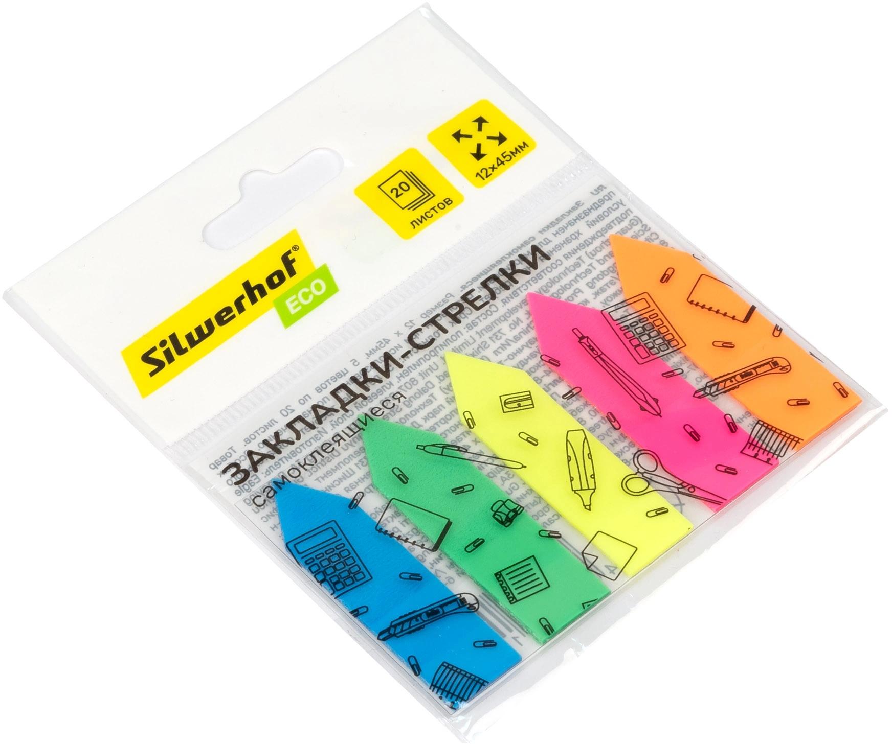 | Закладки пластиковые (липкий блок с клеевым краем) 12*45 SILWERHOF ECO 5 цветов по 20 листов Стрелки (п/упаковка с европодвесом)  Закладки с клеевым краем предназначены для временных пометок страниц. На закладках можно делать надписи. Специальный клеевой состав позволяет надежно крепить и многократно переклеивать закладки, не оставляя следов и не повреждая поверхность. |