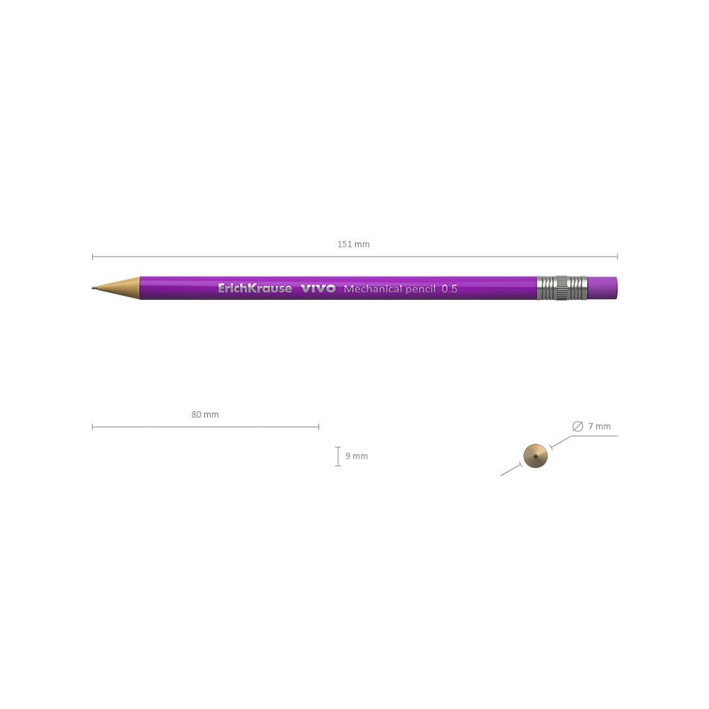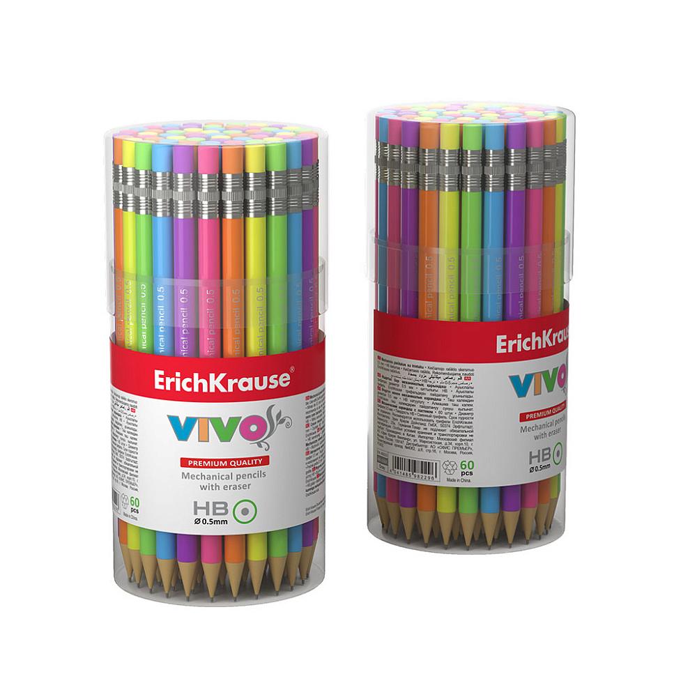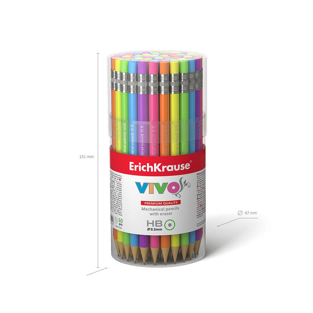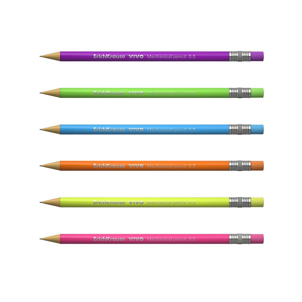 | | Карандаш автоматический 0, 5мм ErichKrause Vivo HB (цветной корпус) Ассорти  Круглый механический карандаш. Корпус и кнопка-ластик в ярких неоновых цветах. Твердость HB. Диаметр грифеля 0.5 мм. |