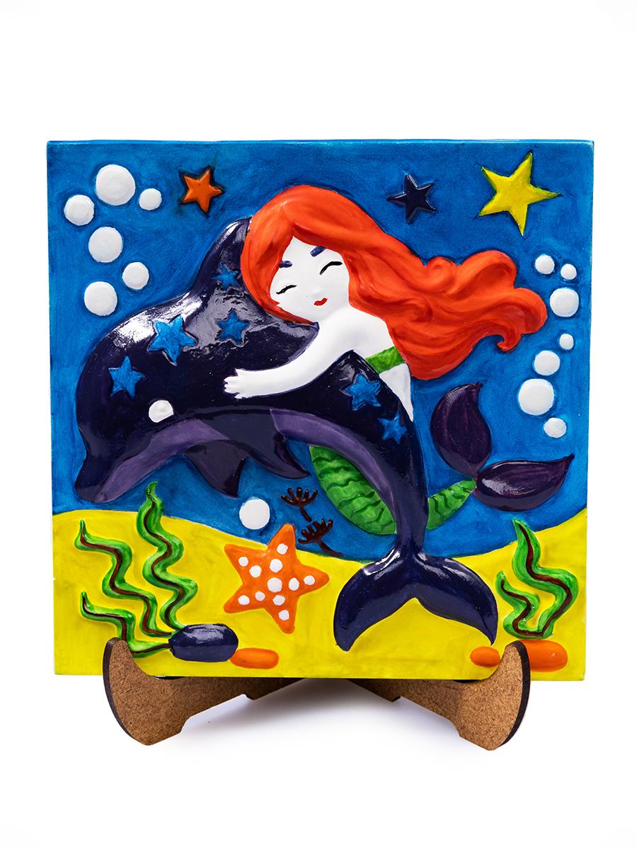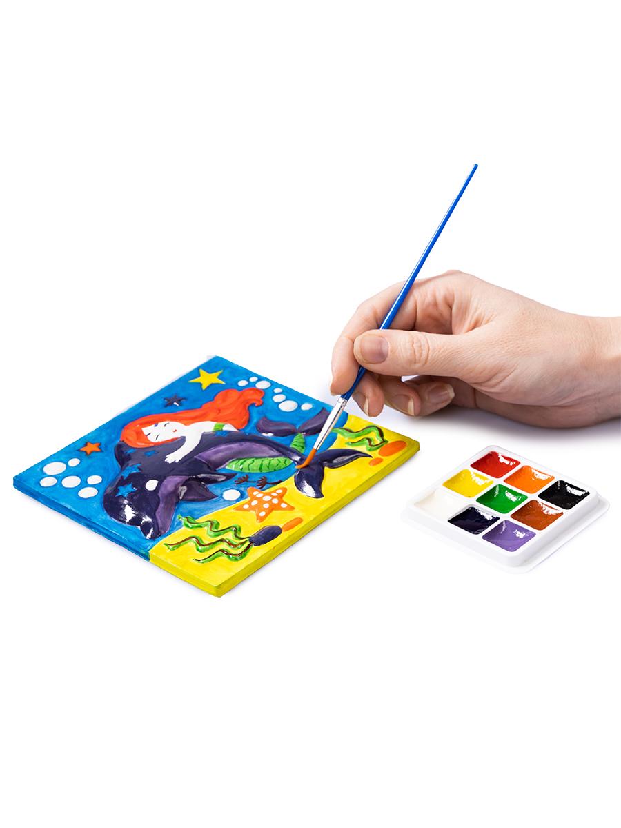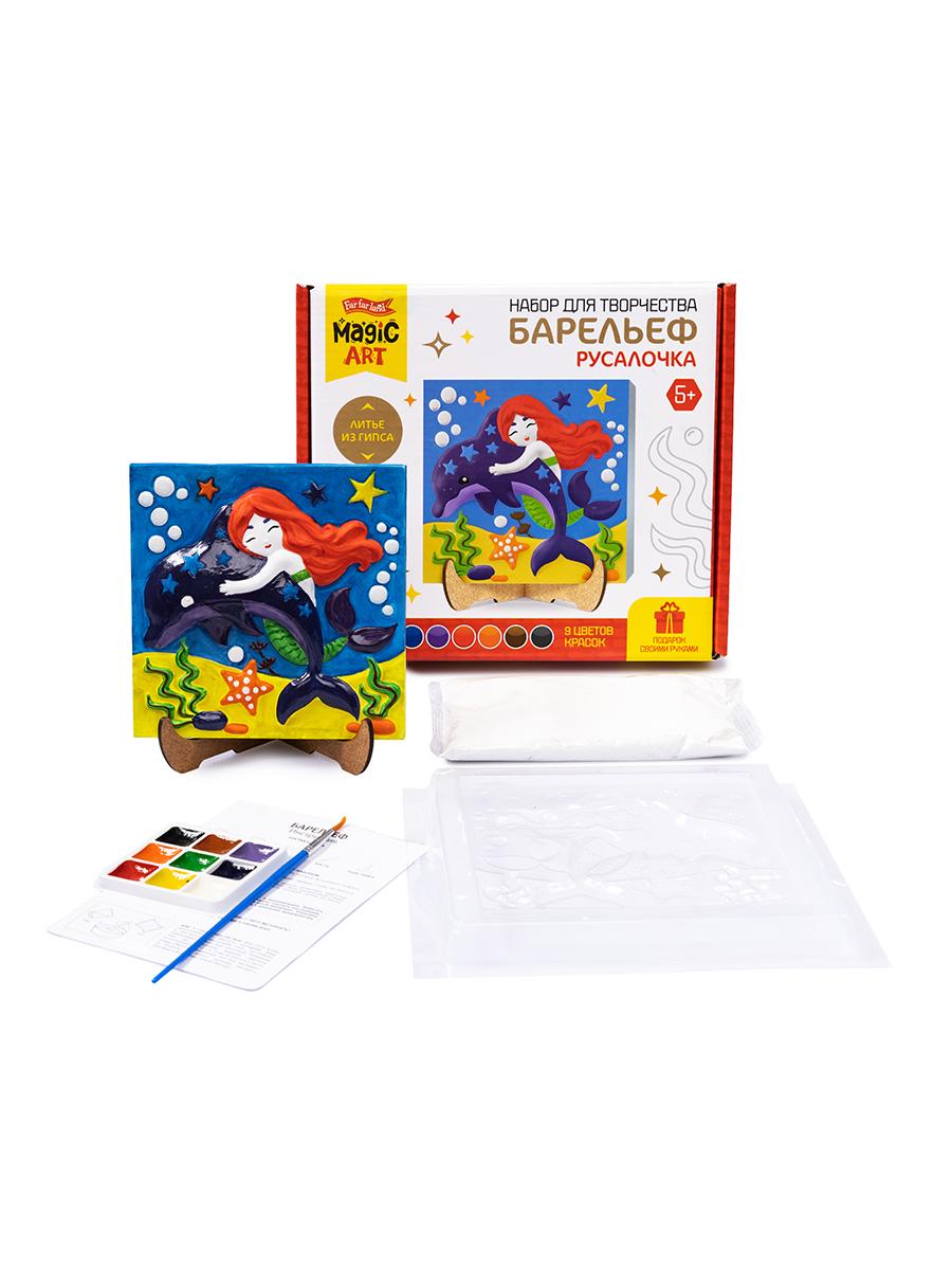 | Набор для творчества (Гипс) ДК Барельеф "Русалочка" (картонная упаковка)   Барельеф - это вариант скульптуры, изображение из гипса с объемными элементами. Созданный своими руками барельеф, станет отличным подарком для друзей и близких и украсит интерьер детской комнаты. В процессе создания гипсовых барельефов ребёнок развивает свой художественный талант, эстетический вкус, мелкую моторику и усидчивость. Состав набора: • гипс – 1 пакет (200 грамм) • форма для отливки – 1 шт. • акварельные краски – 9 цветов • кисточка – 1 шт. • подставка для готового барельефа • инструкция Набор предназначен для детей старше 4 лет. Как работать с гипсом? Вам понадобится удобное рабочее место, которое желательно накрыть газетой или клеенкой. Лучше работать в фартуке или старой одежде, чтобы не бояться испачкаться. Запаситесь ёмкостью, в которой будете смешивать раствор гипса. Это может быть одноразовый стакан, стаканчик из-под йогурта или любая другая ёмкость, которую потом не жалко выбросить. Помогите ребёнку развести и залить раствор в форму, и извлечь барельеф после высыхания. Внимание! Запрещается выливать жидкий гипс в канализацию! 1. Устанавливаем форму в горизонтальном положении. 2. Делаем раствор. Для этого в уже приготовленную ёмкость наливаем воду и постепенно высыпаем гипс, постоянно помешивая ложкой или палочкой. Разводим гипс до состояния жидкой сметаны в соотношении 3:2, т. е. 3 части гипса и 2 части воды. Обратите внимание, что гипс быстро застывает, в течение 10 минут, поэтому заливать готовый раствор в форму нужно сразу. 3. Аккуратно заливаем раствор в пластиковую форму. Чтобы в форме не оставалось пустот и раствор равномерно заполнил всю емкость, форму нужно немного потрясти. Удалите излишки раствора, сделав поверхность отливки максимально ровной. 4. Оставляем заготовку высыхать примерно на 40 минут. 5. Достаем отливку из формы. Если барельеф не выходит, то слегка похлопайте формой о ладонь. Отливка должна получиться гладкой и прочной. 6. К раскрашиванию барельефа можно приступать через 2–3 часа после отливки. Но лучше запастись терпением и сделать это на следующий день, дав гипсу полностью высохнуть.  |