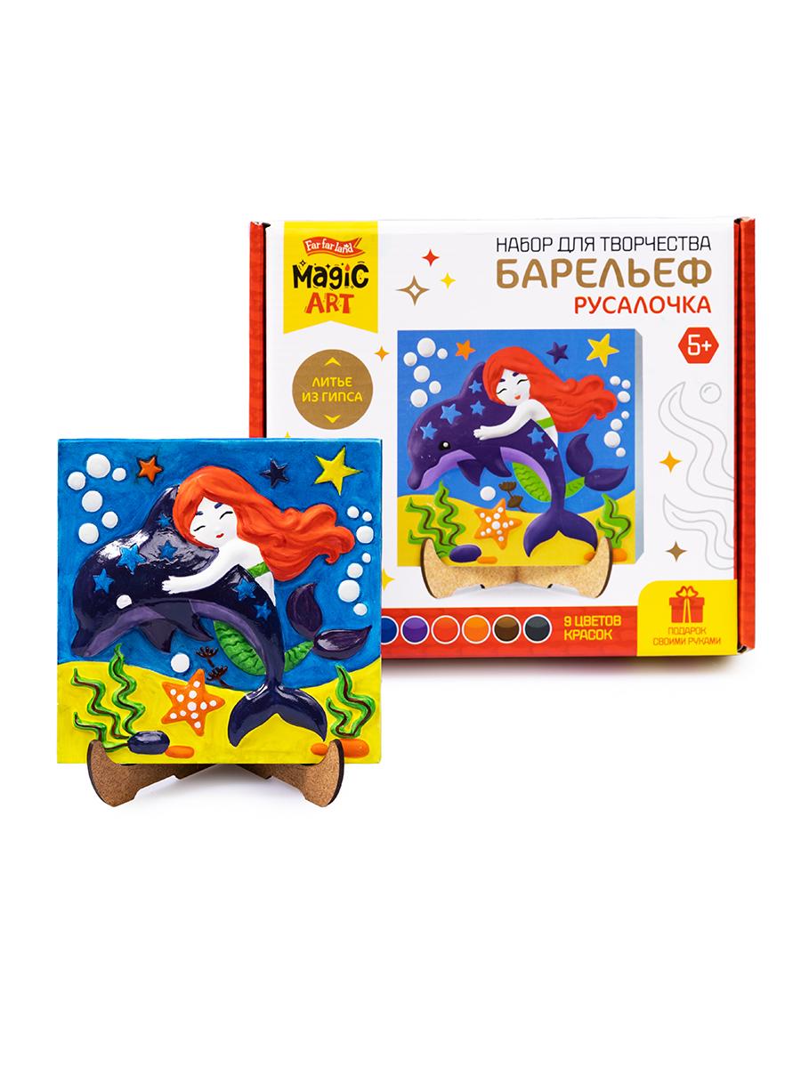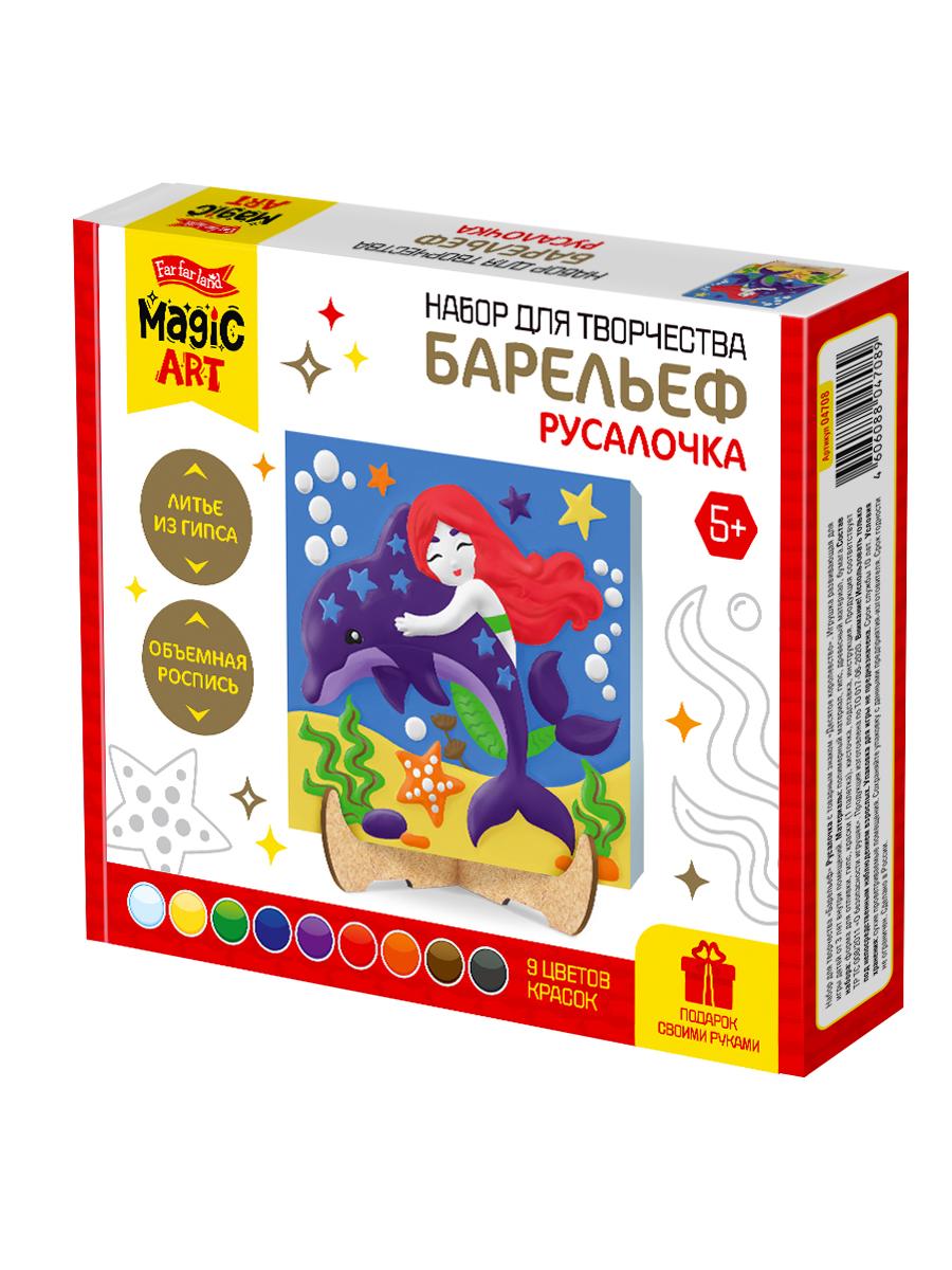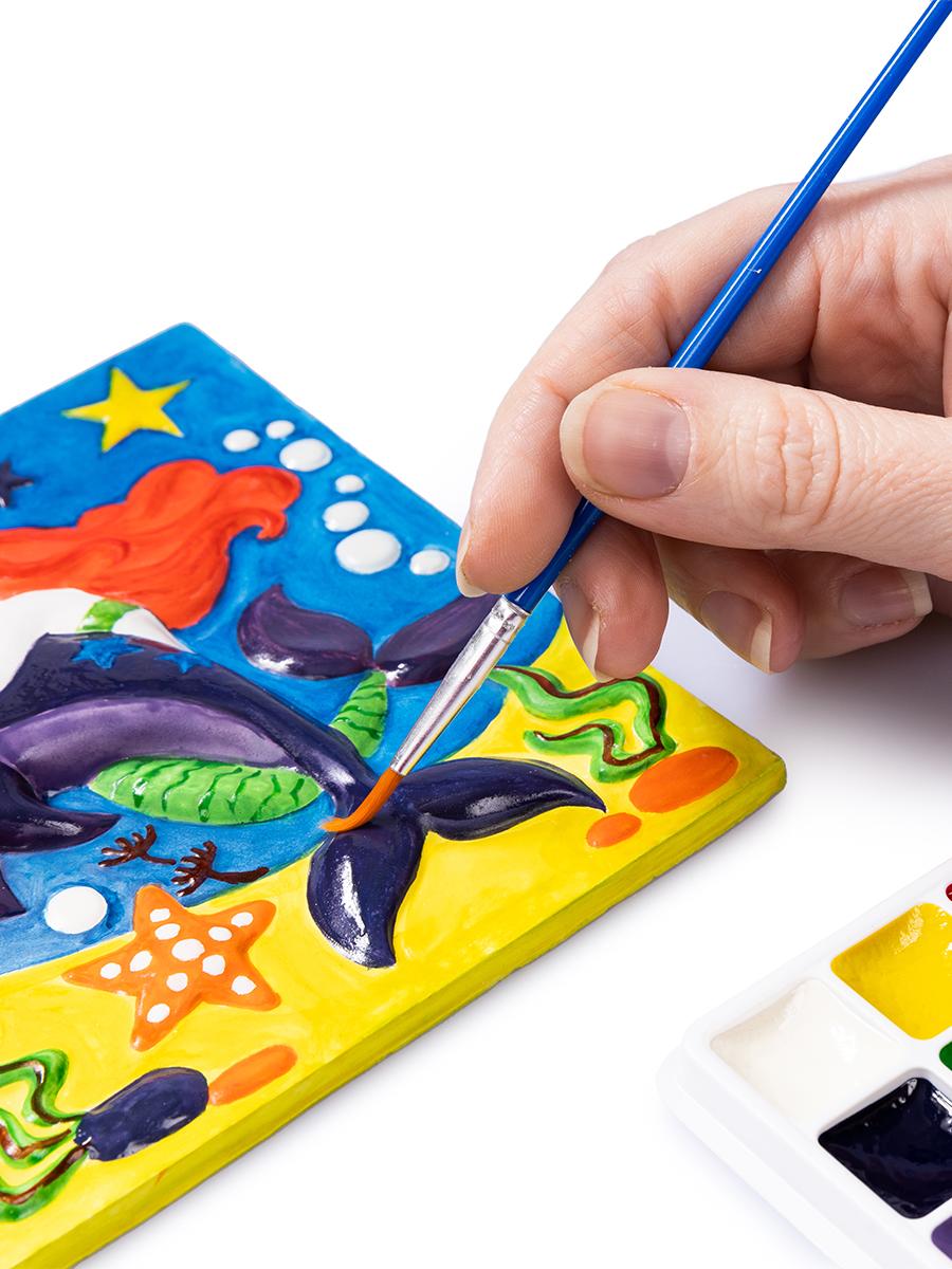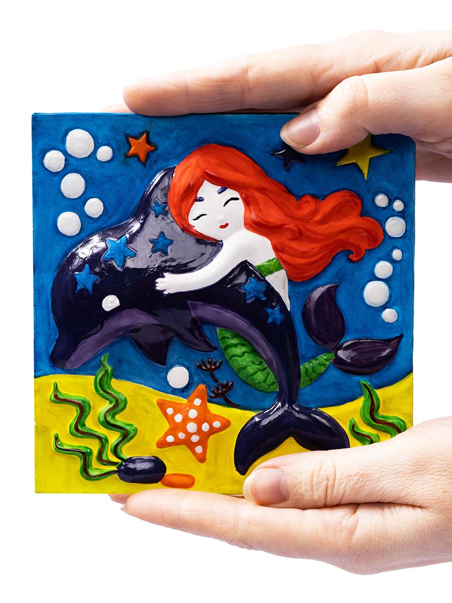 | Набор для творчества (Гипс) ДК Барельеф "Русалочка" (картонная упаковка)   Барельеф - это вариант скульптуры, изображение из гипса с объемными элементами. Созданный своими руками барельеф, станет отличным подарком для друзей и близких и украсит интерьер детской комнаты. В процессе создания гипсовых барельефов ребёнок развивает свой художественный талант, эстетический вкус, мелкую моторику и усидчивость. Состав набора: • гипс – 1 пакет (200 грамм) • форма для отливки – 1 шт. • акварельные краски – 9 цветов • кисточка – 1 шт. • подставка для готового барельефа • инструкция Набор предназначен для детей старше 4 лет. Как работать с гипсом? Вам понадобится удобное рабочее место, которое желательно накрыть газетой или клеенкой. Лучше работать в фартуке или старой одежде, чтобы не бояться испачкаться. Запаситесь ёмкостью, в которой будете смешивать раствор гипса. Это может быть одноразовый стакан, стаканчик из-под йогурта или любая другая ёмкость, которую потом не жалко выбросить. Помогите ребёнку развести и залить раствор в форму, и извлечь барельеф после высыхания. Внимание! Запрещается выливать жидкий гипс в канализацию! 1. Устанавливаем форму в горизонтальном положении. 2. Делаем раствор. Для этого в уже приготовленную ёмкость наливаем воду и постепенно высыпаем гипс, постоянно помешивая ложкой или палочкой. Разводим гипс до состояния жидкой сметаны в соотношении 3:2, т. е. 3 части гипса и 2 части воды. Обратите внимание, что гипс быстро застывает, в течение 10 минут, поэтому заливать готовый раствор в форму нужно сразу. 3. Аккуратно заливаем раствор в пластиковую форму. Чтобы в форме не оставалось пустот и раствор равномерно заполнил всю емкость, форму нужно немного потрясти. Удалите излишки раствора, сделав поверхность отливки максимально ровной. 4. Оставляем заготовку высыхать примерно на 40 минут. 5. Достаем отливку из формы. Если барельеф не выходит, то слегка похлопайте формой о ладонь. Отливка должна получиться гладкой и прочной. 6. К раскрашиванию барельефа можно приступать через 2–3 часа после отливки. Но лучше запастись терпением и сделать это на следующий день, дав гипсу полностью высохнуть.  |
