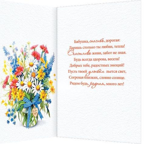 | Открытка Поздравительная Родственникам БАБУШ А5 (МИР ОТКРЫТОК) 2-46-12355А Сам Люб Бабушке На Свете! (конгрев) Бл  Любимая бабушка! Ты настоящая добрая волшебница — своими теплыми словами ты умеешь возвращать в прекрасное и уютное детство. Пусть у тебя на душе всегда будет хорошо и радостно! Здоровья тебе и долгих-долгих лет жизни! |