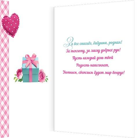 | Открытка Поздравительная Родственникам БАБУШ А5 (МИР ОТКРЫТОК) 2-01-11032А Любимой Бабушке (тиснение золотой фольгой)  Любимой бабушке Бабушка, спасибо, дорогая: Даришь столько ты любви, тепла! Счастливо живи, забот не зная. Будь всегда здорова, весела! Добрых тебе, радостных эмоций! Пусть твоей улыбки льется свет, Согревая близких, словно солнце. Рядом будь, родная, много лет! |