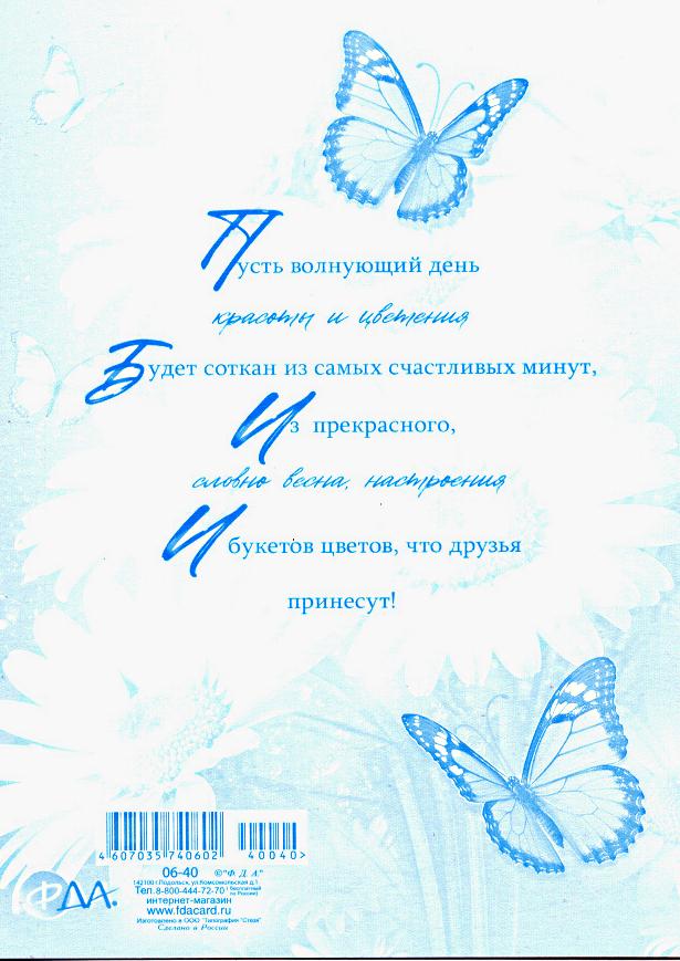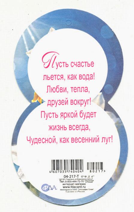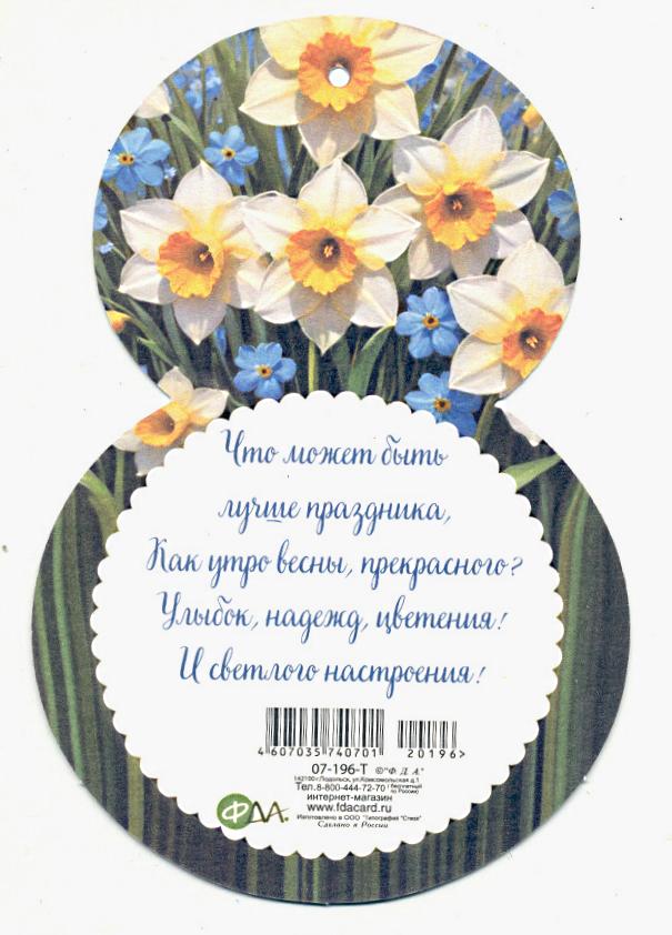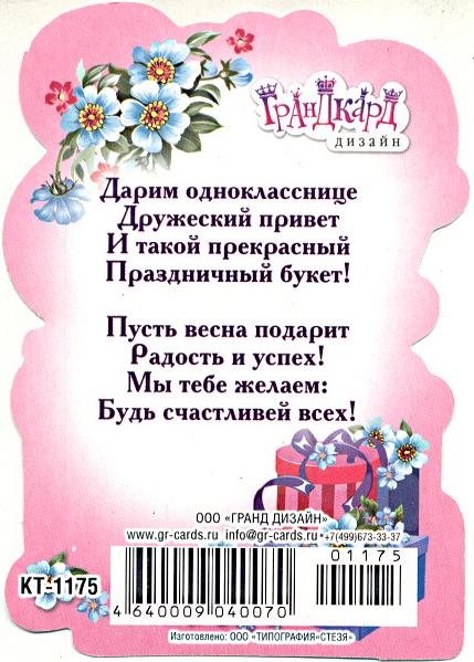 | Открытка 8 МАРТА! мин (Гранд-Микс) КТ-175 Однокласснице 8 Марта (с блестками)  Дарим однокласснице Дружеский привет И такой прекрасный Праздничный букет! Пусть весна подарит Радость и успех! Мы тебе желаем: Будь счастливей всех! |