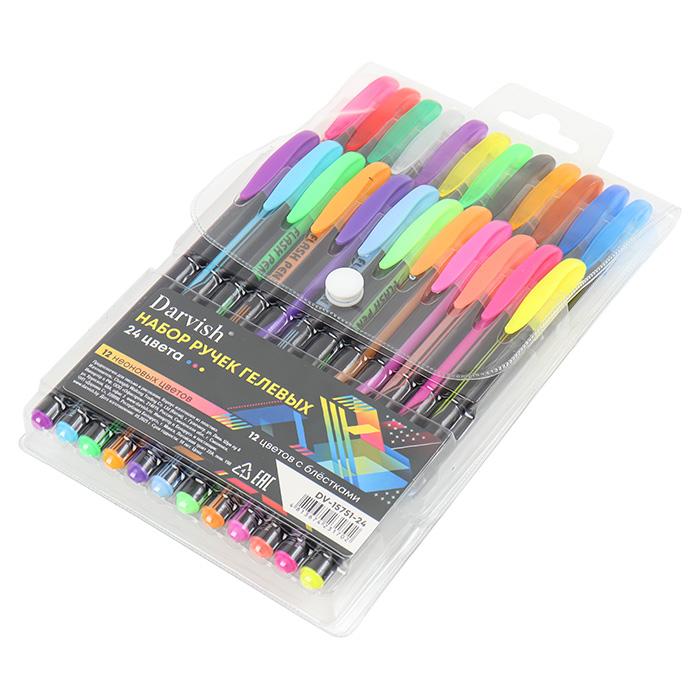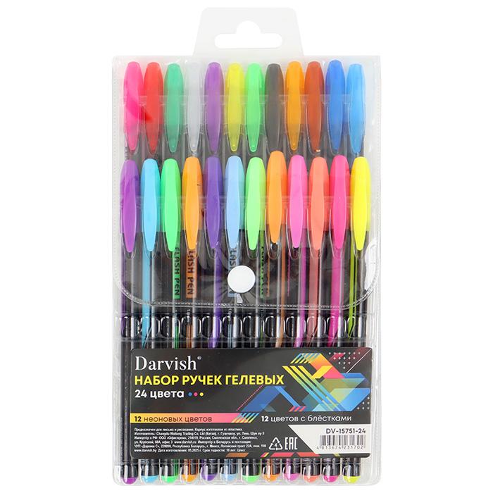 | Ручки гелевые набор 24 цвета (DARVISH) (12 неон + 12 с блетсками) цв корпус (п/упаковка с европодвесом)  Набор ручек гелевых 24 цвета. Комфортное мягкое письмо с минимальным нажимом. Прекрасно подходит для детского творчества: рисования, поделок. Упаковка: поастиковая с европодвесом на кнопке 12,5*22,5*2,5см. |
