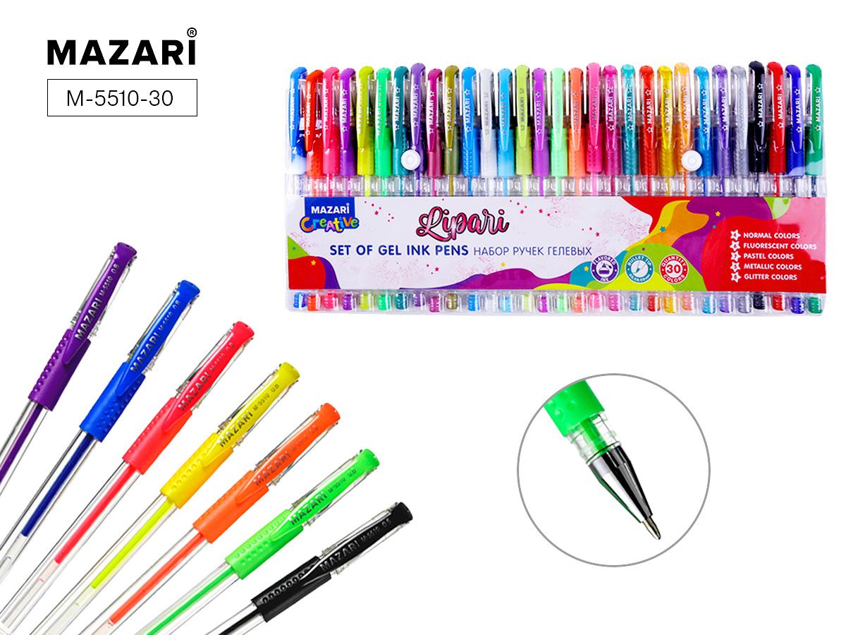 | Ручки гелевые набор 30 цветов MAZARI Lipari 0, 5-0, 9мм (грип-зона из резины) (прозрачный корпус) аром (п/упаковка с европодвесом)  Набор из 30 цветных гелевых ручек. - 4 стандартные 0.5 мм, - 6 неоновых 0.8 мм, - 6 флуоресцентных 0.8 мм, - 6 металлик 0.8 мм, - 8 с блестками 0.8 мм. Пулевидный пишущий узел. Пластиковый корпус. Мягкий грип из синтетического каучука. Сменный стержень 130 мм. ПВХ-упаковка с европодвесом. Рекомендуется использовать стержни TM MAZARI, арт. М-5521, М-7903, М-7902. Состав: металл, пластик, синтетический каучук, чернила. Не рекомендуется детям до 3 лет. Производитель: Китай. |