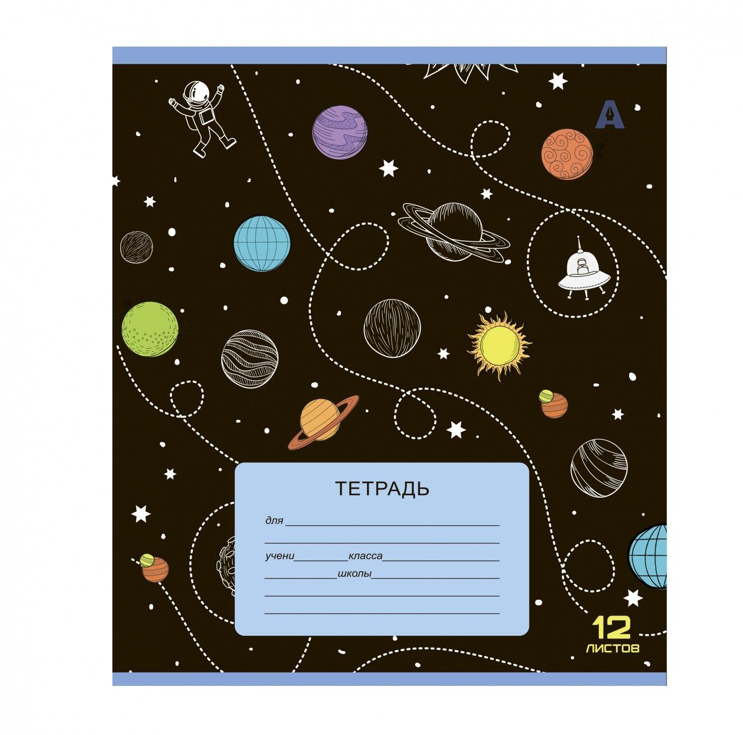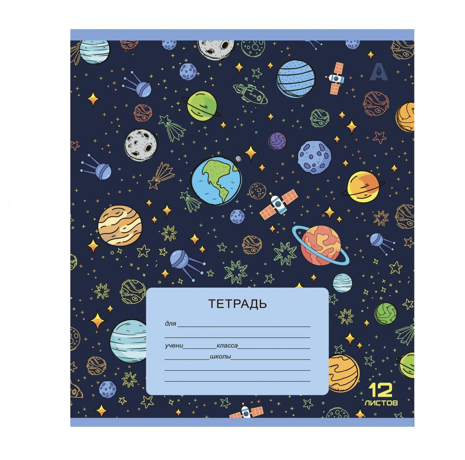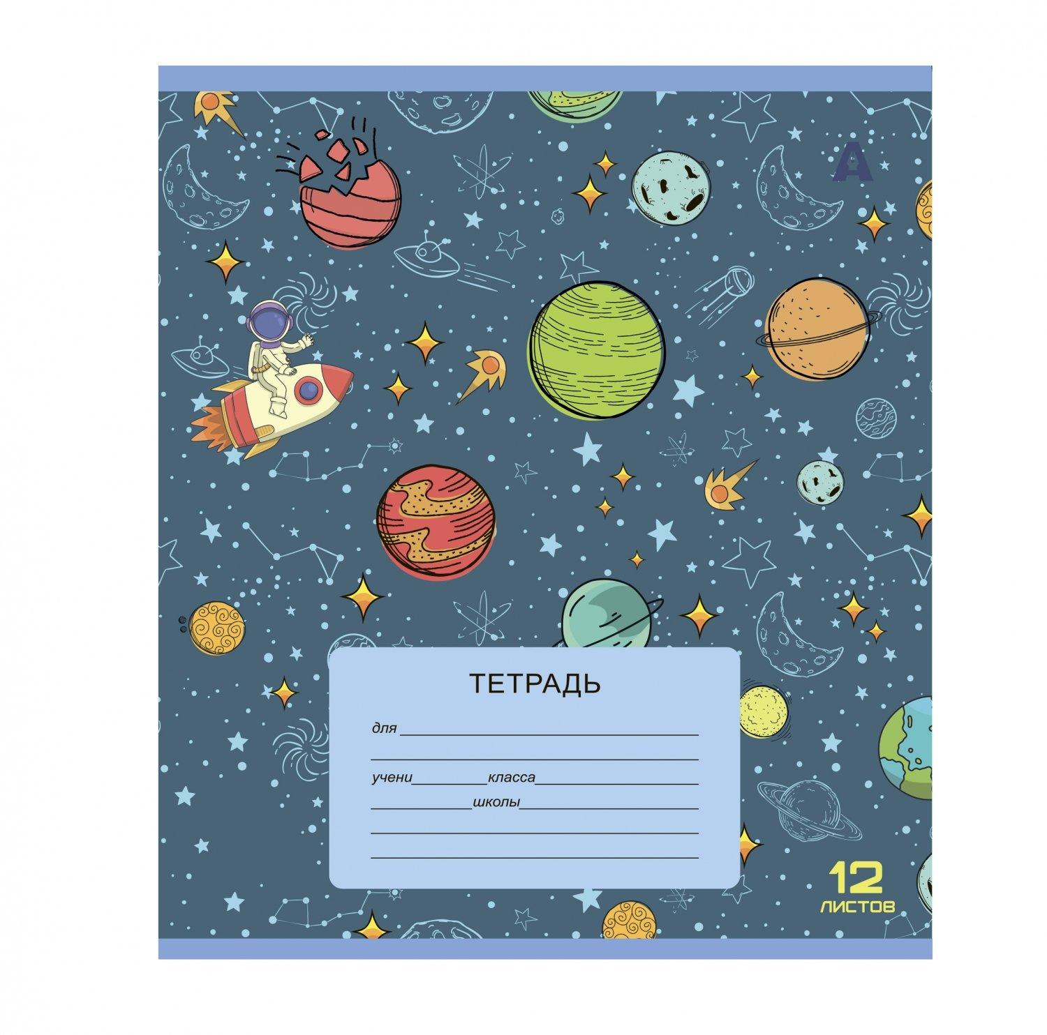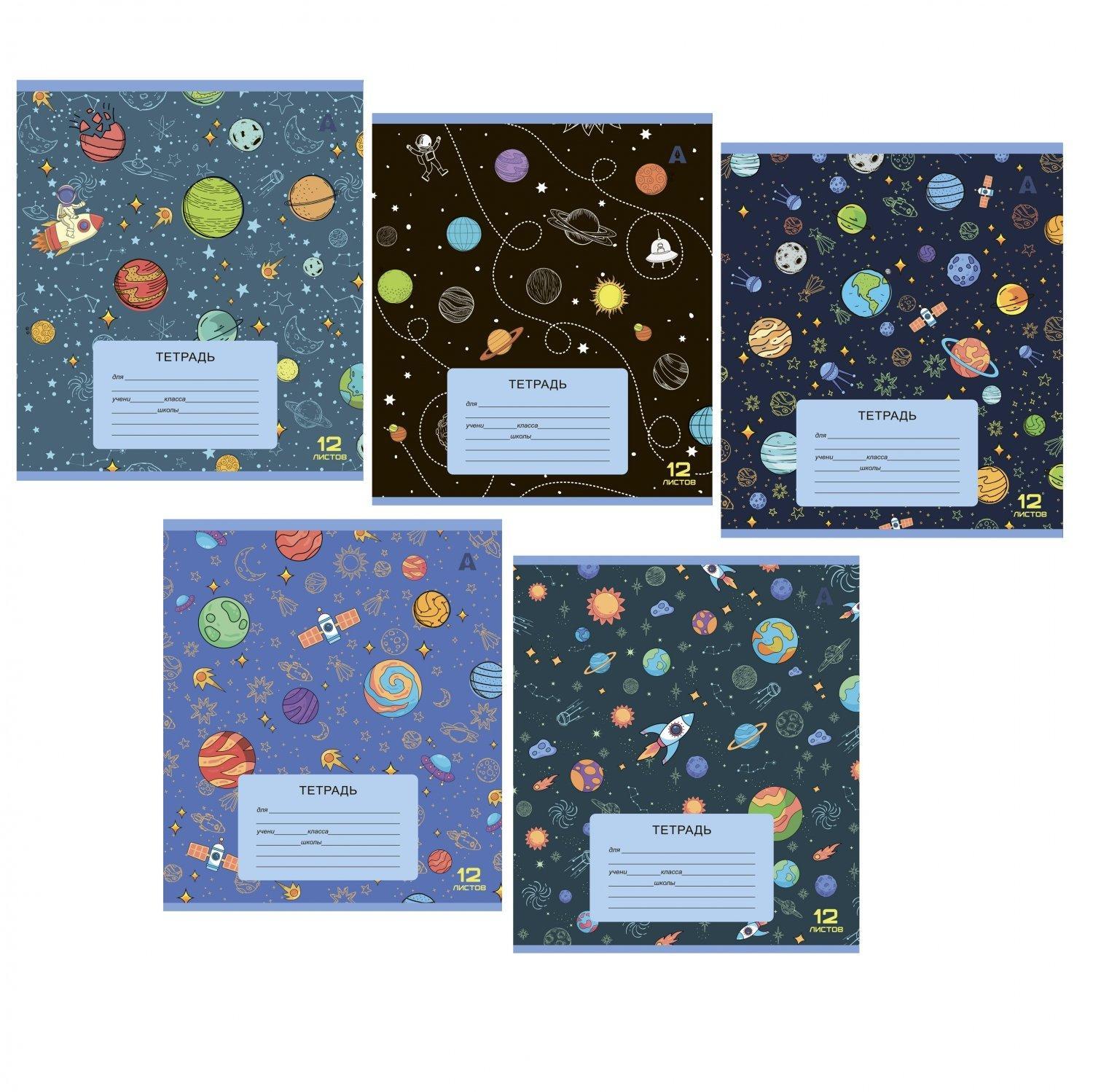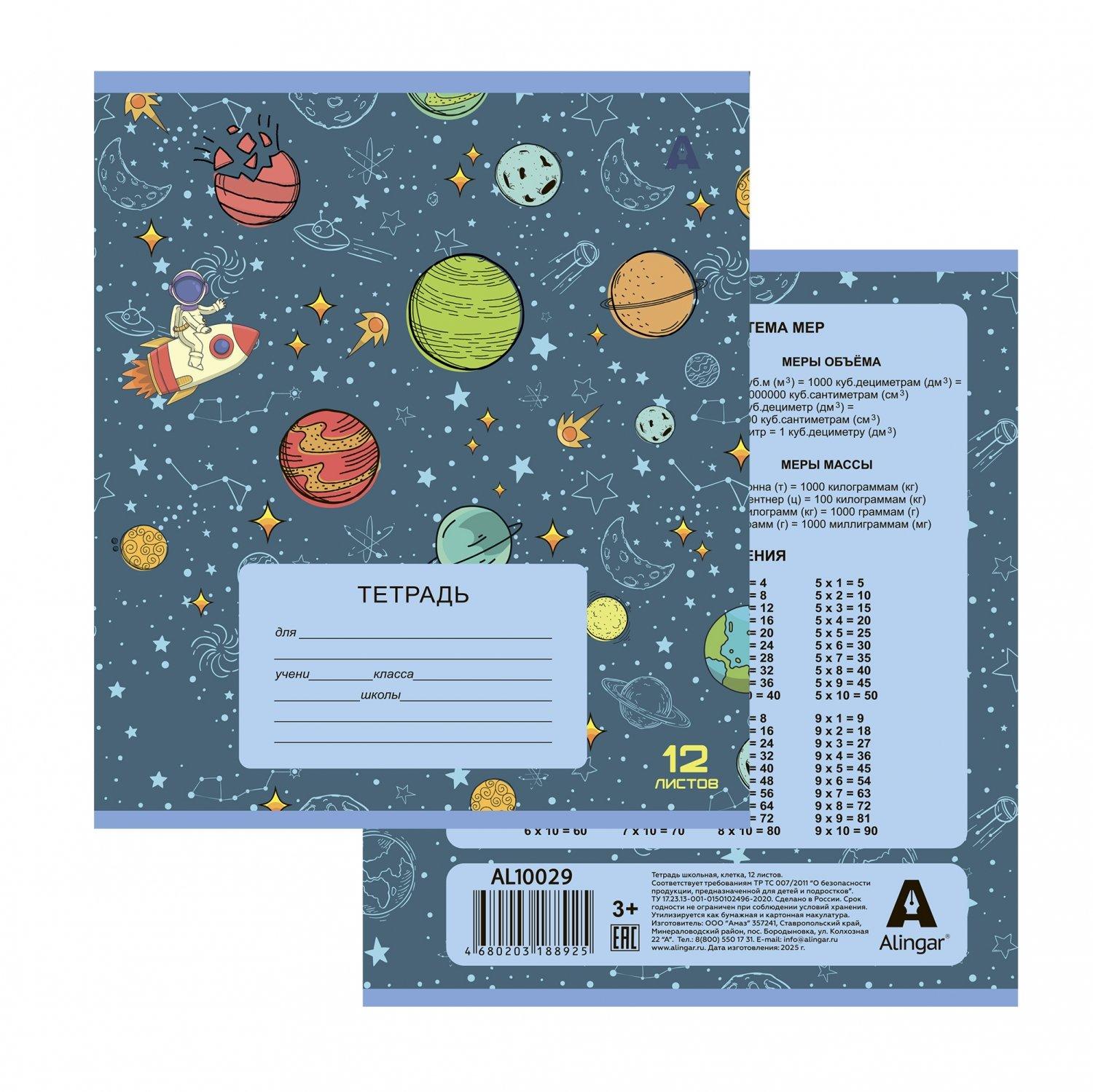 | Тетрадь 12 листов А5 на скрепке (клетка) ALINGAR офсет (мелованная картонная обложка) Космос MIX Ассорти  Тетрадь 12л., клетка, Alingar, скрепка, блок офсет, 100% белизна, мелованный картон (стандарт), "Космос", 5 дизайнов в пленке т/у |