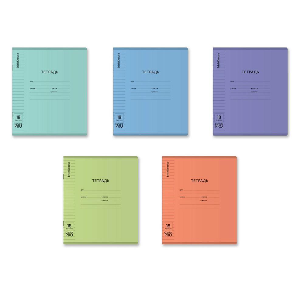 | Тетрадь 18 листов А5 на скрепке (линейка) ErichKrause офсет (пластиковая обложка) CoverPro Класс Pulse Mix-pack Ассорти  Тетрадь школьная ученическая формата А5+ (170x203 мм). Двойная обложка: внешняя выполнена из высококачественного износостойкого цветного пластика с фактурой «песок», внутренняя — из офсетной бумаги. В блоке 18 листов в линейку. Бумага офсетная плотностью 60 г/м2. Цвет линовки — синий. Скругленные уголки обложки и блока. Тип скрепления — скоба. 10 тетрадей пяти разных цветов упакованы в термоусадочную пленку по 2 штуки каждого цвета. |