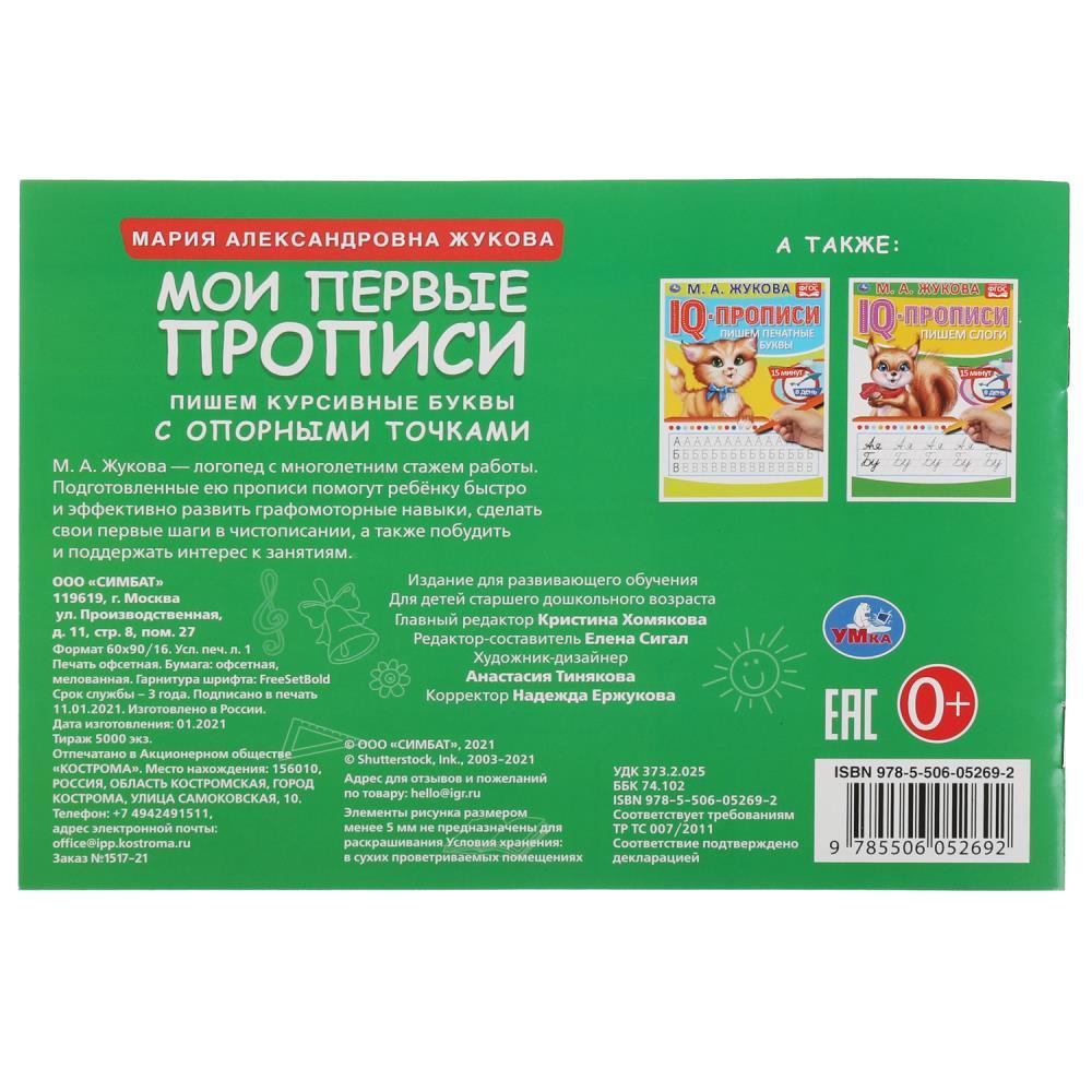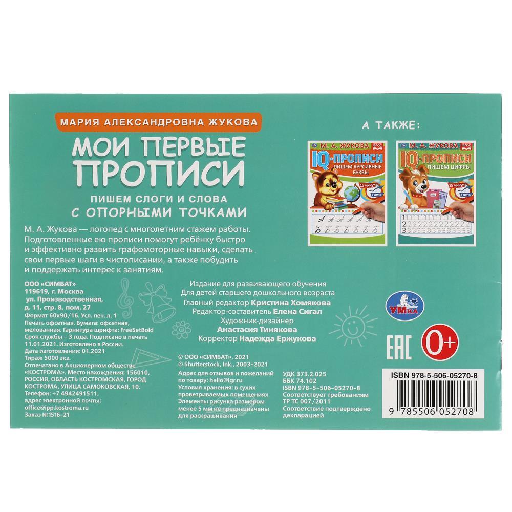 | Прописи УМКА А5 МоиПервПроп Пишем слоги и слова Жукова ( 16 страниц)Марка/Производитель: УМКА  Прописи с опорными точками «М. А. Жукова. Мои первые прописи. Пишем слоги и слова» ТМ «УМка» помогут ребёнку научиться писать красиво и правильно: - плавный переход от пунктирных линий к опорным точкам - учимся писать слоги и слова курсивными буквами - соответствует ФГОС - повторяем азбуку - удобный формат Данные прописи разработаны Марией Александровной Жуковой - педагогом и логопедом с многолетним опытом работы. На страницах этой книжки ребёнка ожидают занимательные упражнения по её авторской методике, направленные на тренировку написания слогов и слов курсивными буквами по опорным точкам. Благодаря компактным размерам прописи удобно брать с собой даже в поездки. Занятия с прописями ТМ «УМка» помогают подготовить руку к письму и способствуют развитию: - мелкой моторики рук - памяти - внимания - творческого мышления - усидчивости Объём: 16 стр. Формат: 205 х 140 мм (А5). Материал: офсетная бумага. Рекомендовано детям старшего дошкольного возраста. |