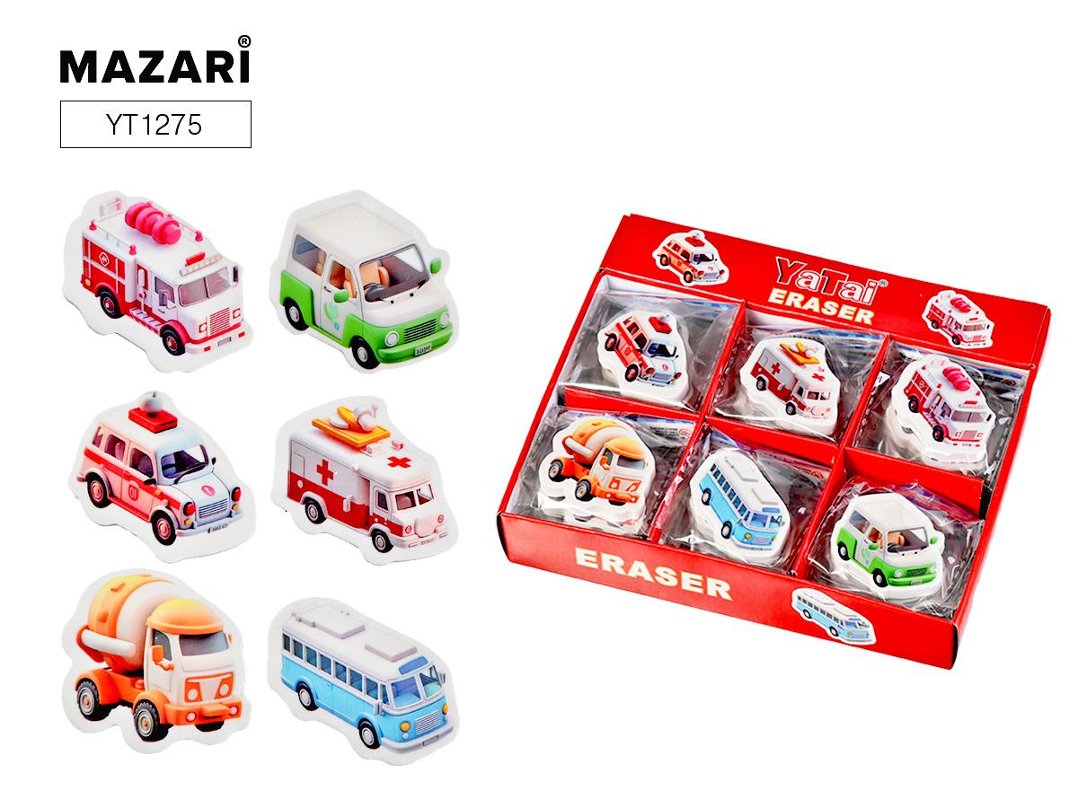 | | Ластик фигурный MAZARI Машинки (термопластичная резина) 40*35* 6мм (п/упаковка с европодвесом) Ассорти  Ластик МАШИНКИ, термопластичная резина, 3.5*4*0.6 см, фигурный, 6 дизайнов, ОПП-упаковка / картонный дисплей |
