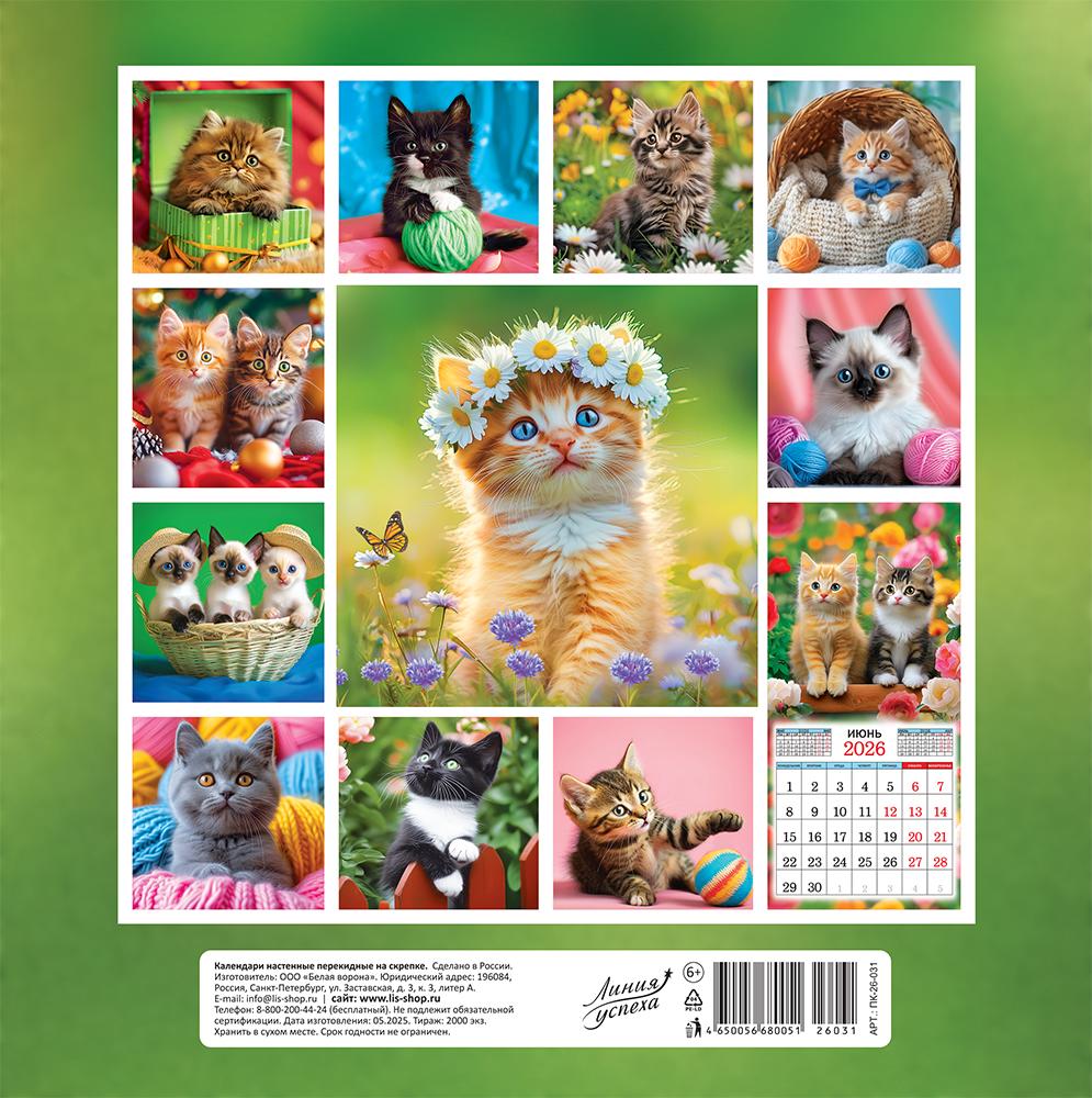 | Календарь на 2026год настенный на скрепке 12 листов (ФОНТАНКА) БПК-26-024 29*29см Котята (п/упаковка с европодвесом)  Настенный календарь - это универсальный атрибут дома и офиса. Помимо своей основной функции - сообщать текущую дату; он помогает планировать дела, подводить итоги дня, недели и месяца. Яркий и красивый календарь может служить украшением стены и оживлять дизайн помещения. Календарями пользуются бизнесмены и политики, менеджеры и преподаватели, медики, студенты и школьники. Его можно использоватьи в домашнем обиходе; отмечать события и дела, связанные с жизнью семьи, обучать ребенка ориентироваться в днях недели. Человечество изобрело календарь для того, чтобы иметь возможность планировать будущее. |