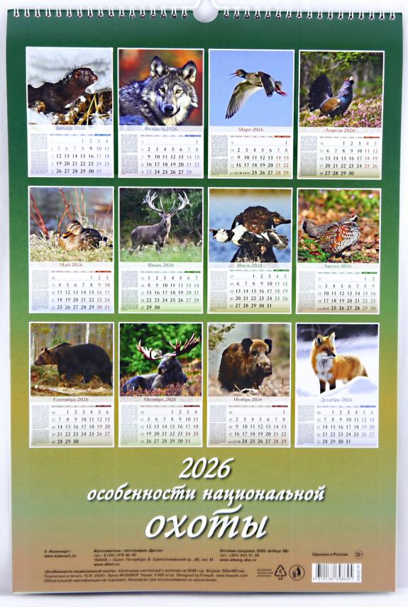 | Календарь на 2026год настенный на спирали АТБ 0526028 32*48см Особенности нац охоты (п/упаковка с европодвесом)  Настенный календарь - это универсальный атрибут дома и офиса. Помимо своей основной функции - сообщать текущую дату; он помогает планировать дела, подводить итоги дня, недели и месяца. Яркий и красивый календарь может служить украшением стены и оживлять дизайн помещения. Календарями пользуются бизнесмены и политики, менеджеры и преподаватели, медики, студенты и школьники. Его можно использоватьи в домашнем обиходе; отмечать события и дела, связанные с жизнью семьи, обучать ребенка ориентироваться в днях недели. Человечество изобрело календарь для того, чтобы иметь возможность планировать будущее |