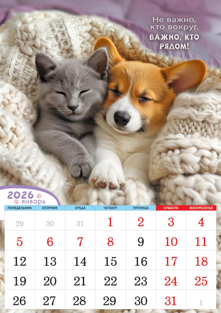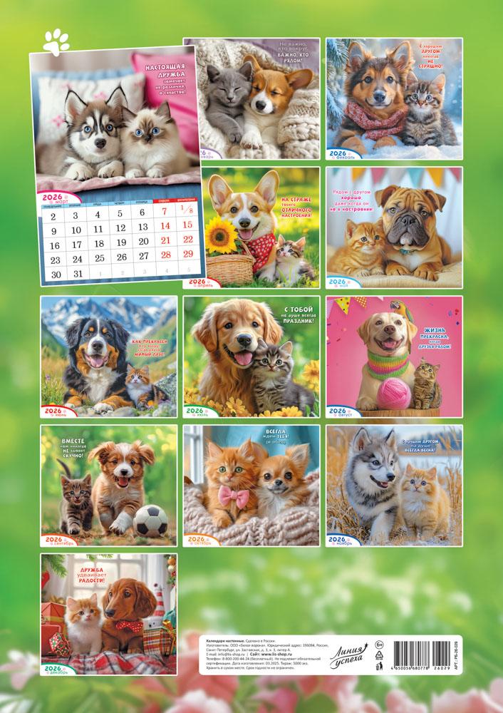 | Календарь на 2026год настенный на спирали (ФОНТАНКА) РБ-26-029 34*48см Кот и пес Верные друзья (п/упаковка с европодвесом)  Настенный календарь - это универсальный атрибут дома и офиса. Помимо своей основной функции - сообщать текущую дату; он помогает планировать дела, подводить итоги дня, недели и месяца. Яркий и красивый календарь может служить украшением стены и оживлять дизайн помещения. Календарями пользуются бизнесмены и политики, менеджеры и преподаватели, медики, студенты и школьники. Его можно использоватьи в домашнем обиходе; отмечать события и дела, связанные с жизнью семьи, обучать ребенка ориентироваться в днях недели. Человечество изобрело календарь для того, чтобы иметь возможность планировать будущее. Размер 340х480мм, 6 листов. Обложка: УФ-лак, картон 225гр/м2. Внутренний блок: мелованная бумага 100 гр/м2. В УПАКОВКЕ. |