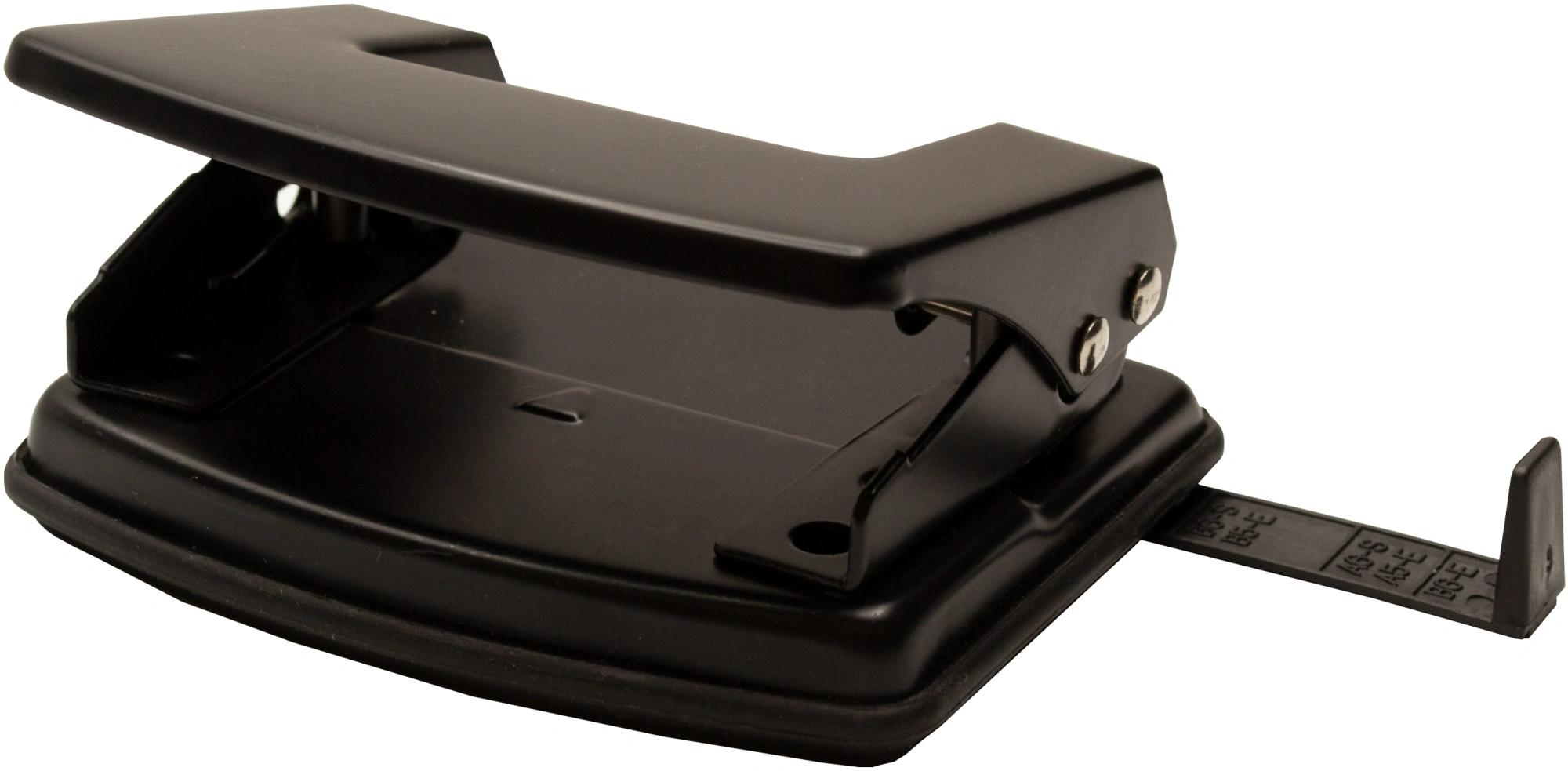 | Дырокол 20 листов ALINGAR с линейкой черный (картонная упаковка)  Дырокол пластиковый оснащен выдвижной ограничительной линейкой с точной шкалой форматов бумаги. Пробивная мощность до 20 листов. Диаметр отверстия небольшой, всего 6 мм. Удобный резервуар для конфетти. Пластиковая подошва не царапает поверхность стола. Корпус выполнен в чёрном цвете. |