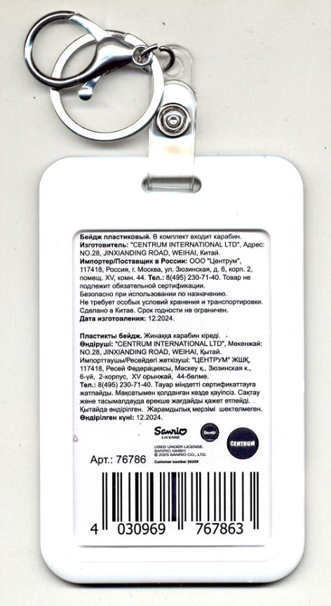 | | Бейдж нагрудный вертикальный CENTRUM 110*70 Kuromi карабин (п/упаковка с европодвесом) Ассорти  Бейдж предназначен для идентификации участников конференций, тренингов и курсов, сотрудников компаний, может использоваться для визитных карточек и пропусков. Размер 110х70 мм: достаточно, чтобы крупным шрифтом набрать имя, фамилию и должность человека. Специальная выемка предназначена для быстрой и удобной смены вкладыша. Сейчас этот атрибут уже просто необходим в офисах, при проведении презентаций, выставок. |