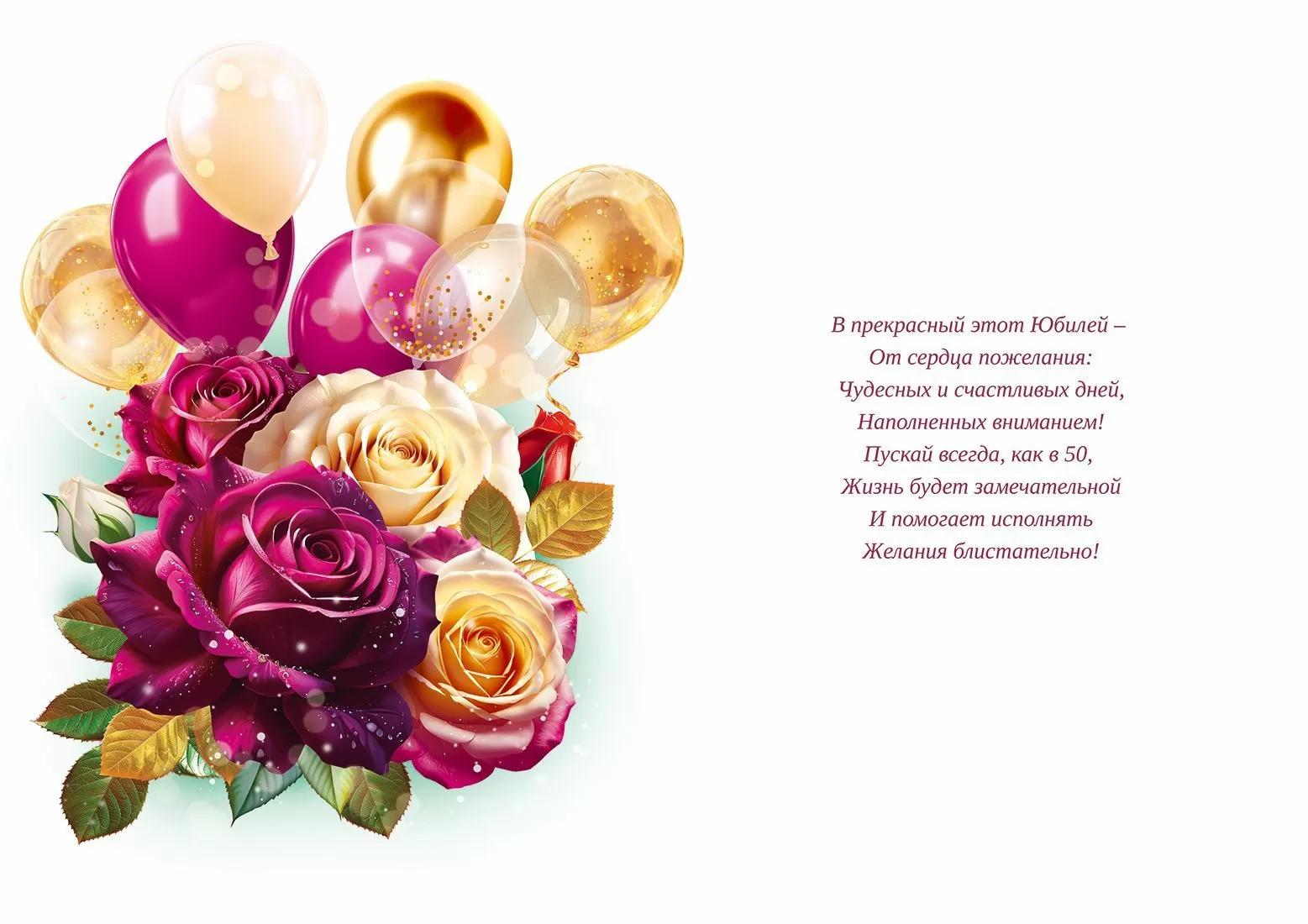 | Открытка ЮБИЛЕЙ ДАТЫ А4 50 лет (МИР ОТКРЫТОК) 1-46-2503А С Юбилеем! 50 лет (женская) (конгрев) (с блестками)  Какой сегодня яркий юбилей! Уютный дом украсили букеты! Пусть все желанья сбудутся скорей, Вниманьем близких будут дни согреты! Пусть мир всегда сияет красотой, Сбывается все то, что сердце просит! И в жизни день любой и миг любой Как можно больше радости приносит! |