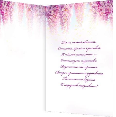 | | Открытка ЮБИЛЕЙ ДАТЫ А5 50 лет (МИР ОТКРЫТОК) 2-46-12386А С Юбилеем! 50 лет (женская) (конгрев) (с блестками)  Сегодня повод замечательный Дарить цветы и пожелания Красивой, милой, обаятельной, Той, что полна очарования! Вся жизнь пусть будет как соцветие Мгновений солнечных и ярких И в день пятидесятилетия Ждут комплименты и подарки! |