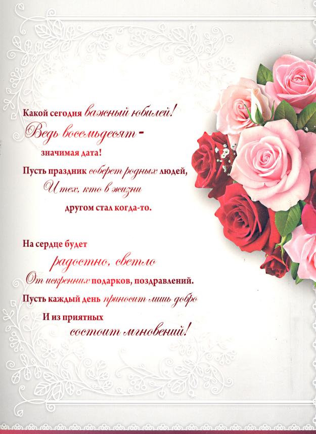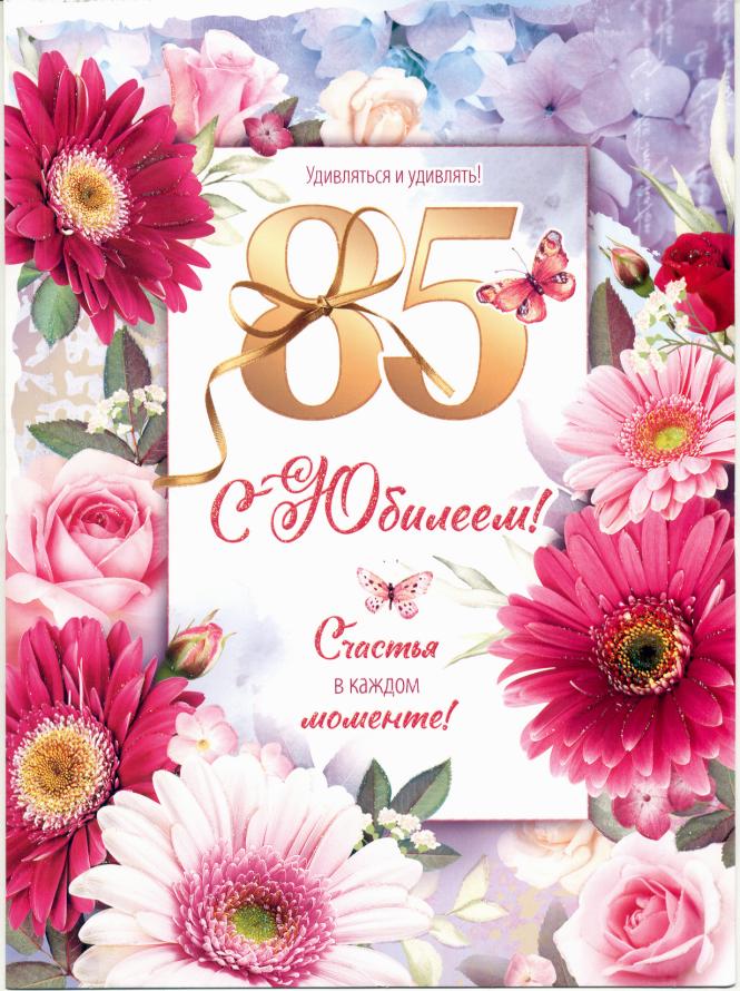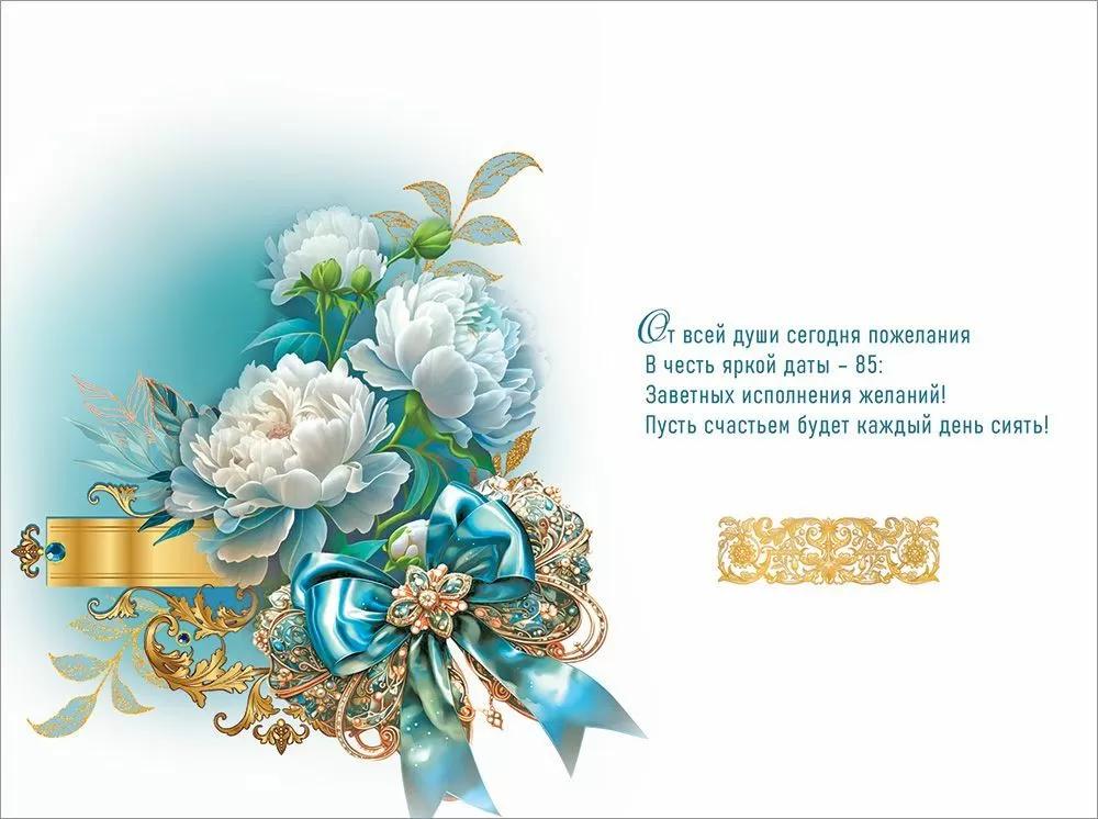 Открытка «С Юбилеем! 85» в формате А5 украсит любое поздравление и сделает его незабываемым. Классический дизайн в ярких, насыщенных оттенках придется по душе всем и привлечет много внимание на празднике. Изображение нежных белых цветов дополняет изысканный бант. Золотой орнамент поддерживает общую композицию. Внутри открытки – прекрасные стихи с приятными пожеланиями, а также есть место для того, чтобы оставить подпись. Качественные материалы производства и печати обеспечивают прочность и долговечность изделия, поэтому оно станет замечательным памятным сувениром для своего получателя.