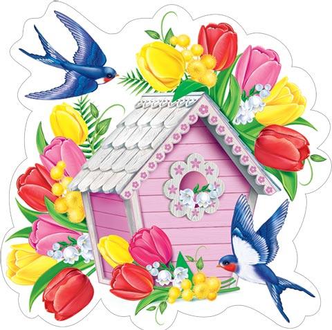 | | Открытка для оформления 8 МАРТА! А4 (МИР ОТКРЫТОК) 7-64-8022А Скворечник, цветы (вырубка) на скотче (с блестками)