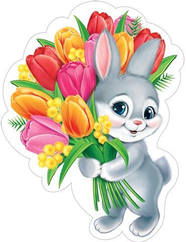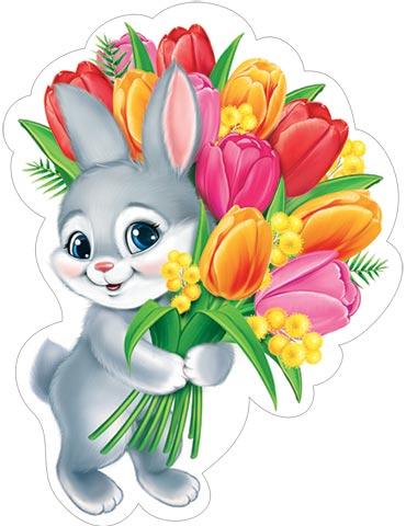 | Открытка для оформления 8 МАРТА! А4 (МИР ОТКРЫТОК) 7-64-8023А Зайка с букетом (вырубка) на скотче (с блестками)