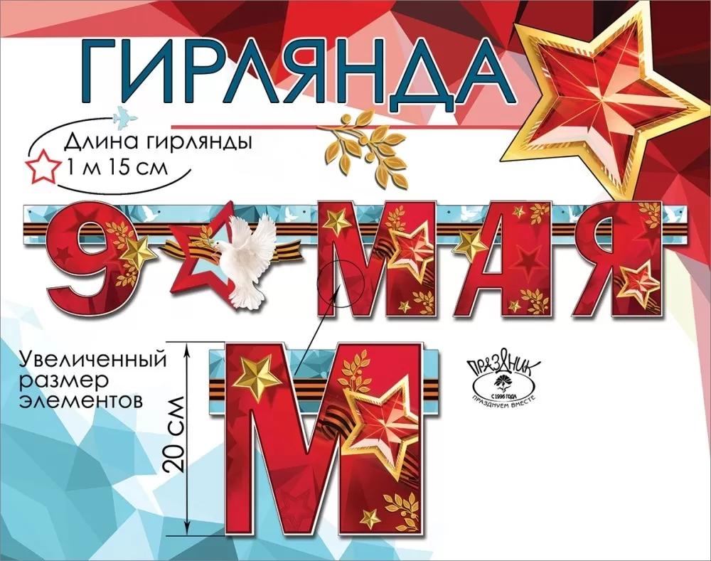 | ГИРЛЯНДА картонная 9 МАЯ (ДЕНЬ ПОБЕДЫ) (ПРАЗДНИК) 6400200 1 15м 9 Мая! (п/упаковка с европодвесом)  Гирлянда-растяжка из плотного картона. Материал прочный, хорошо держит форму. Сверху на картонную основу нанесено красочное полноцветное изображение, покрытое глянцевым УФ-лаком. Гирлянда не требует сборки — все детали скреплены между собой колечками пикколо (мини-люверсами). Для крепления к поверхности можно использовать булавки, канцелярские кнопки или скотч (не входят в комплект). Гирлянда отлично подходит для оформления фотозоны. |