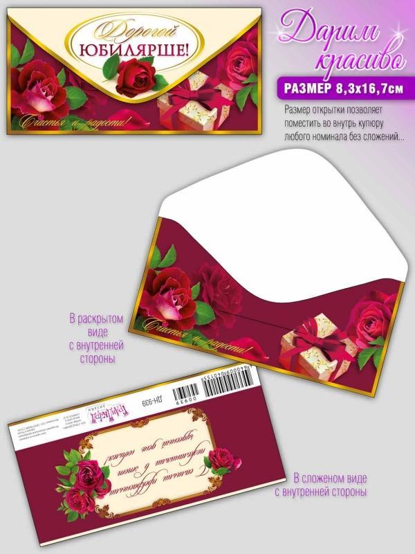 Открытка Поздравительная Юбилей для денег (ФОНТАНКА) ОКЛ-215 С Юбилеем (без текста) лак  Размер конверта для денег 16,5 на 8 см. Изготовлен в России из плотного картона 225 г/мкв с покрытием из УФ лака. |