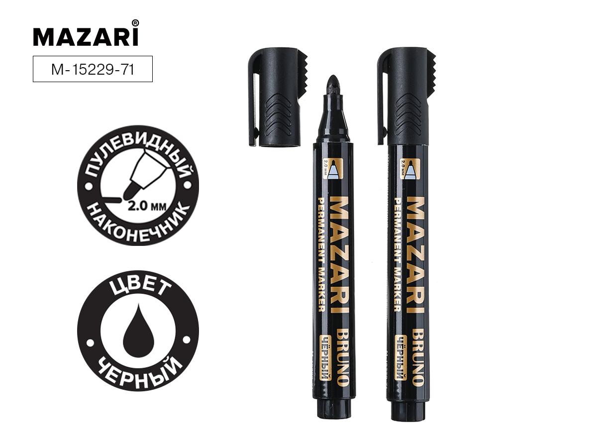 | Маркер перманентный (пулевидный пишущий узел) MAZARI Bruno 2мм черный с режущ эл  Перманентный маркер предназначен для письма на любой поверхности: бумага, полиэтилен, дерево, стекло, металл, натуральная кожа, ткань, камень, плитка. Чернила могут глубоко проникать сквозь бумагу, поэтому лучше всего рисовать или писать на картоне. Особая нестираемая основа перманентного маркера обеспечивает такие качества, как стойкость к воздействию воды, ультрафиолету, низким и высоким температурам. Благодаря спиртовой основе чернила быстро сохнут и не размазываются. Износостойкий наконечник устойчив к повреждениям и обеспечивает экономный расход чернил. Изделие не перезаправляется. Плотно закрывается колпачком, что предотвращает высыхание наконечника и чернил. Цвет колпачка соответствует цвету чернил. |