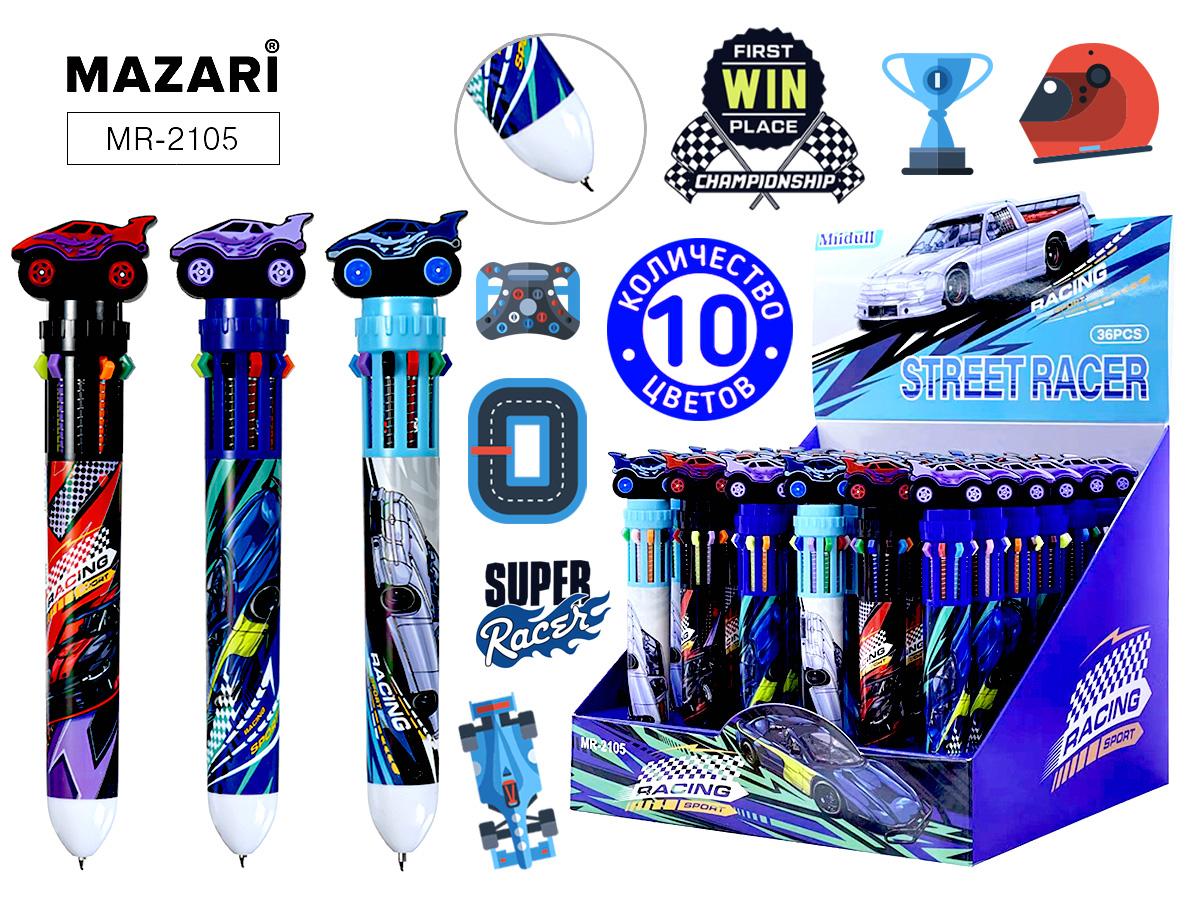 | | Ручка многоцветная (многостержневая) автоматическая 10 цветов MAZARI Racing 0, 7мм (цветной корпус с рисунком) Ассорти  Ручка шариковая автоматическая RACING, 10 цв. (ФИОЛЕТОВЫЙ, ЧЕРНЫЙ, СИНИЙ, КРАСНЫЙ, ОРАНЖЕВЫЙ, ЗЕЛЕНЫЙ, ЖЁЛТЫЙ, ГОЛУБОЙ, РОЗОВЫЙ, КОРИЧНЕВЫЙ), пулевидный пиш.узел 0.7мм, корпус пластиковый цветной