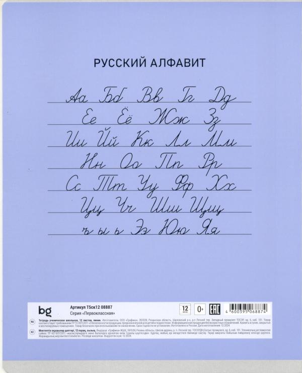 | Тетрадь 12 листов А5 на скрепке (линейка) BG офсет (картонная обложка) Первоклассная MIX Ассорти  Тетрадь школьная BG серия «Первоклассная» формата А5 на скрепке состоит из 12 листов. Внутренний блок – это офсетная бумага плотностью 60 г/м2, белизна − 100%, линовка – линия с полями. Обложка тетради изготовлена из мелованного картона. Однотонные тетради идеально подойдут для школьников любого года обучения. Сзади на обложке-русский алфавит • Кол-во листов: 12; • Линовка: линия с полями; • Белизна: 100%; • Плотность блока: 60 г/м2; • Крепление: скрепка; • Материал обложки: мелованный картон. |