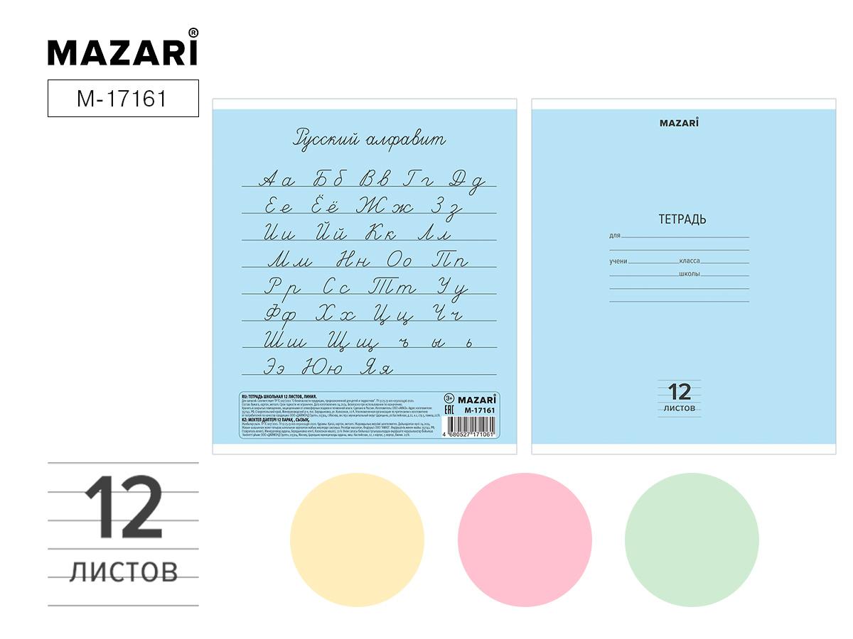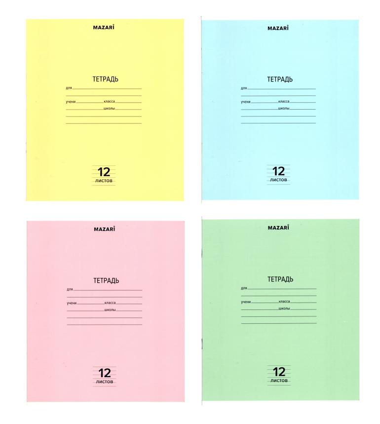Тетрадь 12 листов А5 на скрепке (линейка) MAZARI офсет (картонная обложка) MIX Ассорти  Тетрадь 12л А5 линия, скрепка, блок - офсет, обложка -картон мелованный, ассорти 4 цвета в спайке |