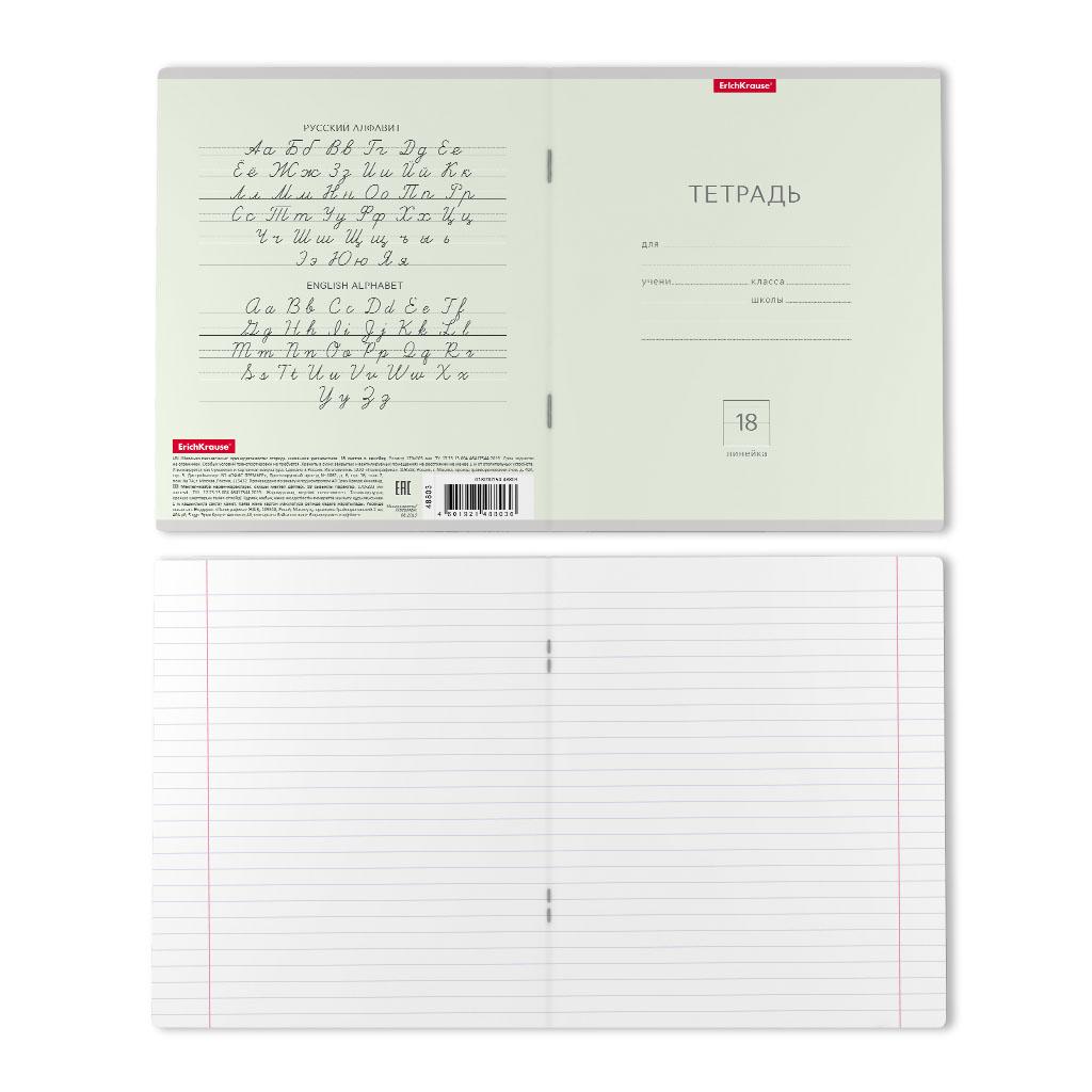 | Тетрадь 18 листов А5 на скрепке (линейка) ErichKrause офсет (картонная обложка) Классика Линовка зеленая  Тетрадь школьная ученическая формата А5+ (170х203 мм). Обложка из высококачественного мелованного картона плотностью 170 г/м2. В блоке 18 листов в линейку с полями. Бумага офсетная плотностью 60 г/м2. Цвет линовки - синий. Скругленные уголки обложки и блока. Тип скрепления - скоба. Тетради одного дизайна упакованы в термоусадочную пленку по 10 штук.