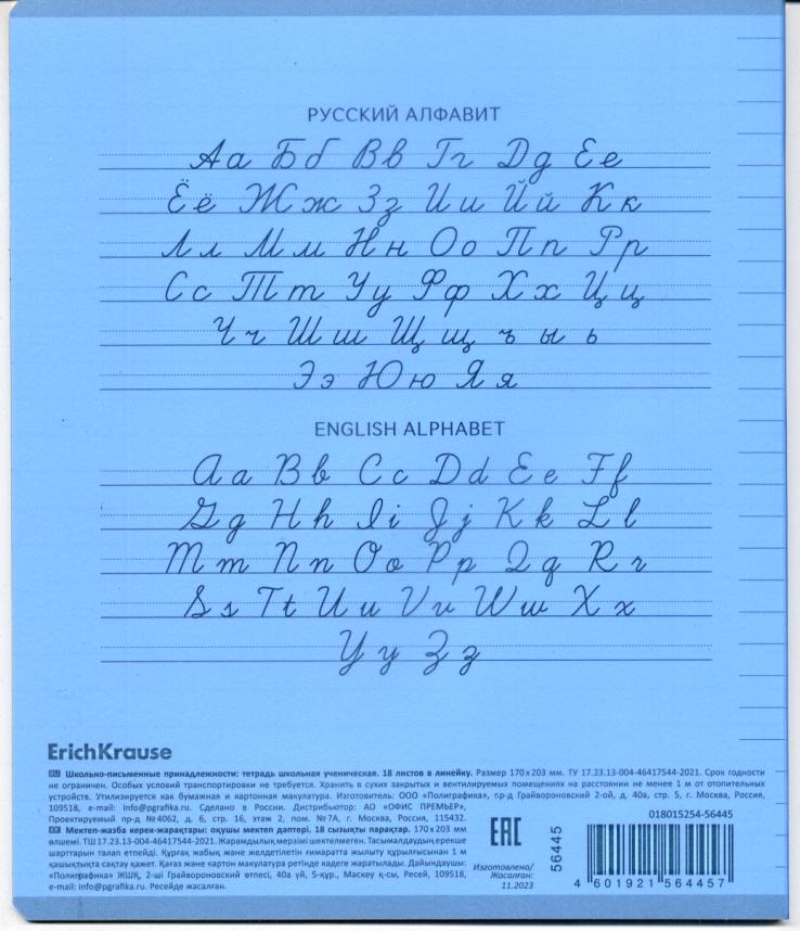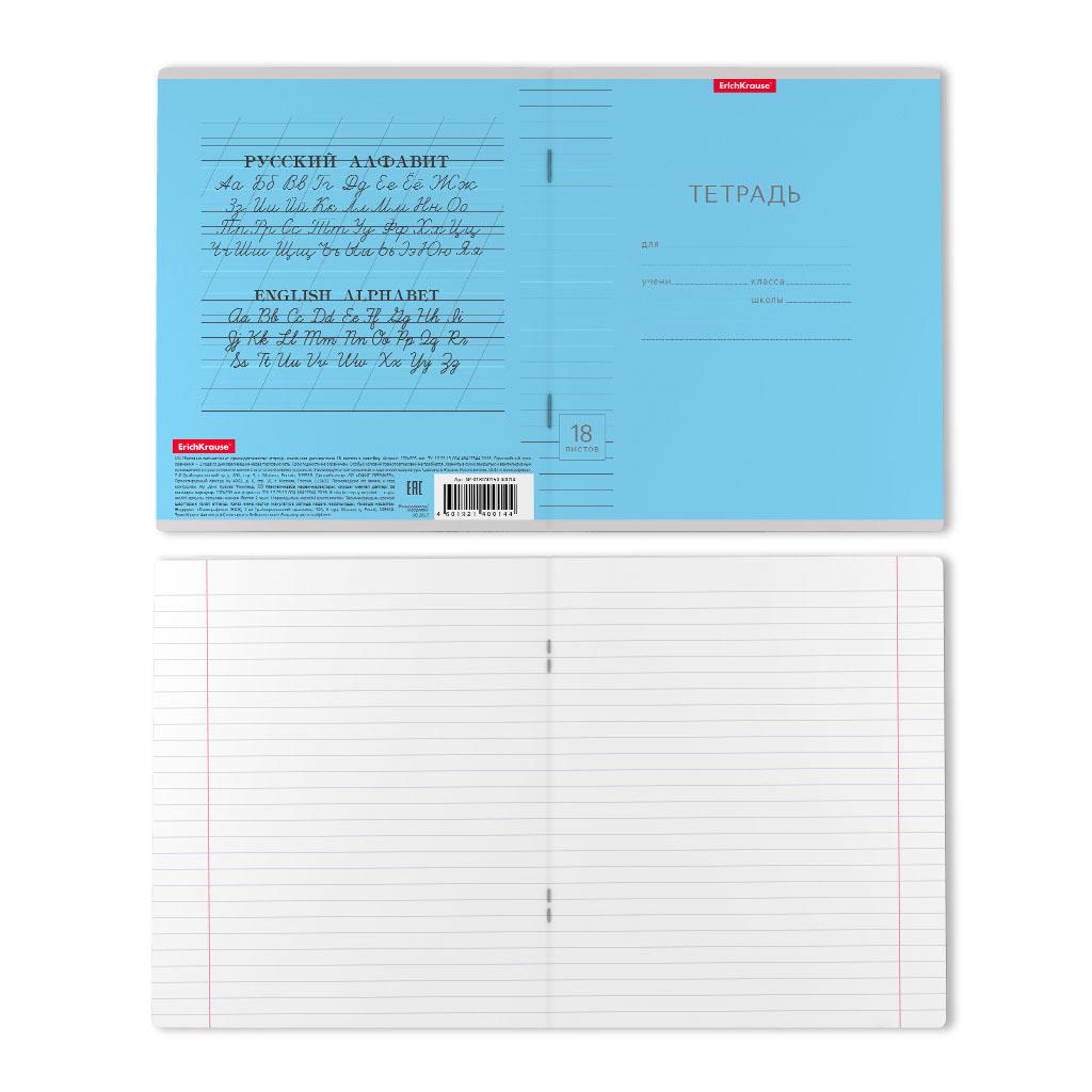 | | Тетрадь 18 листов А5 на скрепке (линейка) ErichKrause офсет (картонная обложка) Классика Линовка голубая  Тетрадь школьная ученическая формата А5+ (170х203 мм). Обложка из высококачественного мелованного картона плотностью 170 г/м2. В блоке 18 листов в линейку с полями. Бумага офсетная плотностью 60 г/м2. Цвет линовки - синий. Скругленные уголки обложки и блока. Тип скрепления - скоба. Тетради одного дизайна упакованы в термоусадочную пленку по 10 штук.