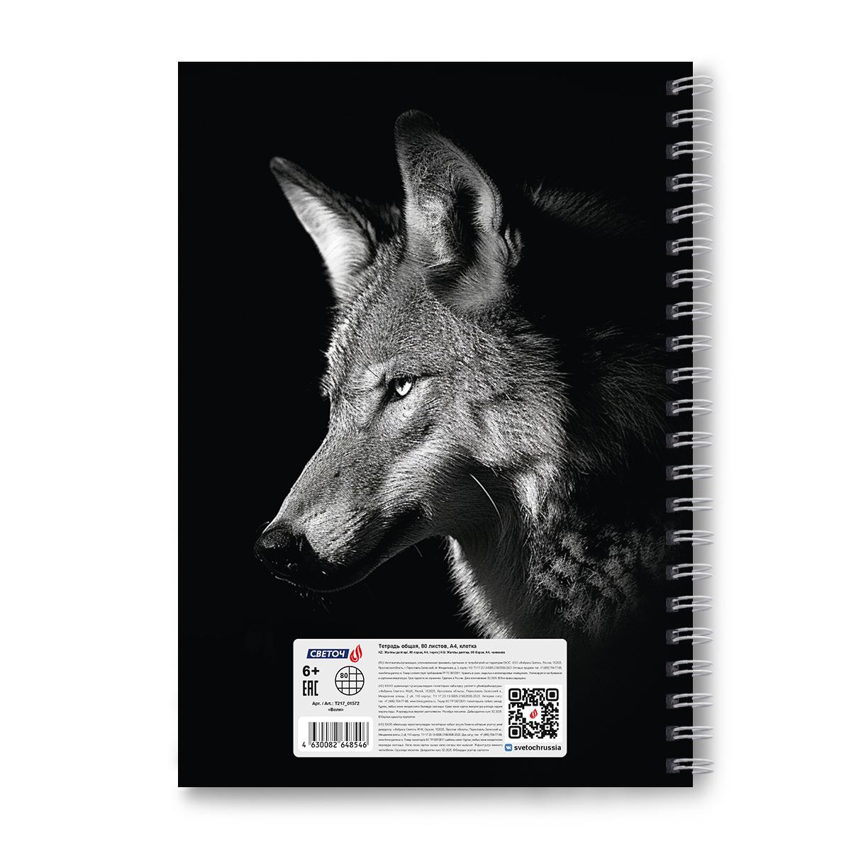 | Тетрадь общая А4 на гребне (твердая обложка) 80 листов (клетка) SVETOCH офсет (матовая ламинация) Волк  Тетрадь общая А4 формата, 80 листов предназначена для учащихся средних и старших классов, учащихся вузов, а также прекрасно подойдет для дома и офиса. Внутренний блок изготовлен из качественной офсетной бумаги плотностью 65 г/кв. м, 100% белизны. Обложка - твердый картон. Дизайн изделия дополнен спецэффектом в виде матовой ламинации. Линовка - клетка, без полей. Вид скрепления - гребень. Скрепление гребень позволяет раскрывать тетрадь на 360 градусов. |