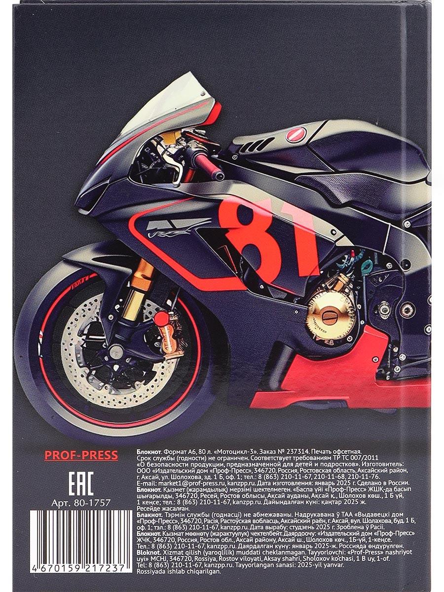 | Книжка записная (твердая обложка) А6 80 листов ИДП (клетка) (глянцевая ламинация) Мотоцикл-3  Бизнес-блокнот от компании "Проф-Пресс" — необходимый атрибут в жизни каждого делового человека. Подойдёт для важных и повседневных записей на работе, дома и в офисе. Формат А6 (110x148 мм), 80 листов, твёрдый переплёт 7БЦ, цветная мелованная обложка с глянцевой ламинацией. |