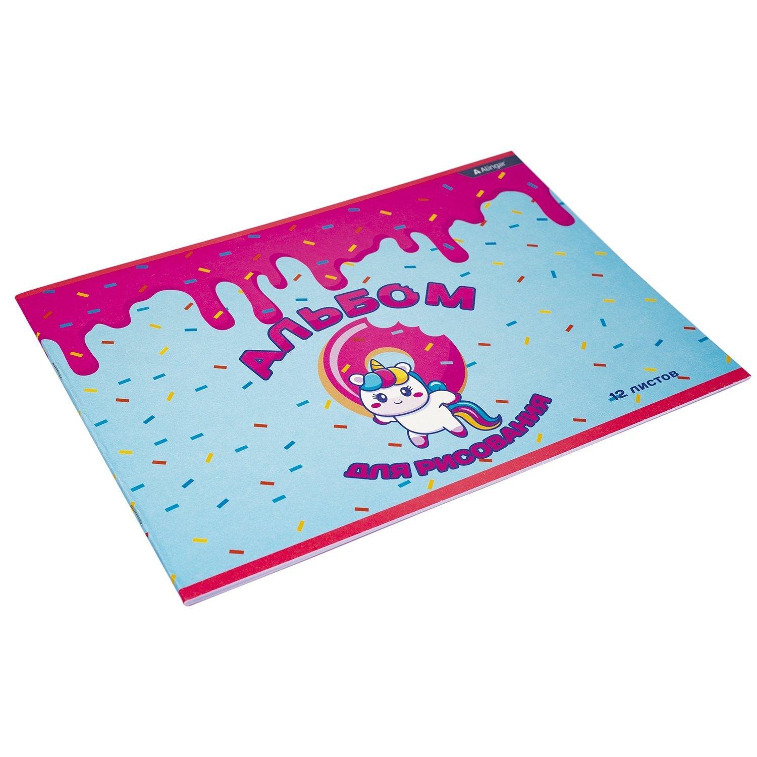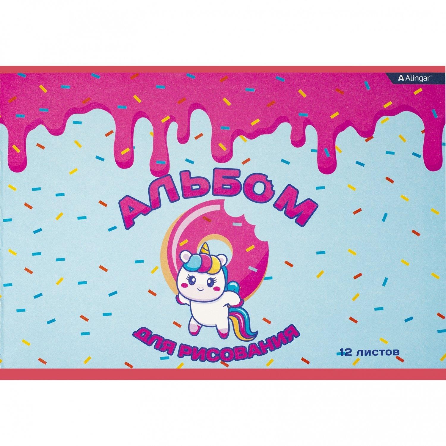 | Альбом для рисования А4 12 листов ALINGAR (картонная обложка) Единорожка и пончик (плотность бумаги 100 г/кв м)  Альбом для рисования А4 12л., Alingar, на скрепке, немелованный картон (стандарт), 100 г/м2, "Единорожка и пончик" |