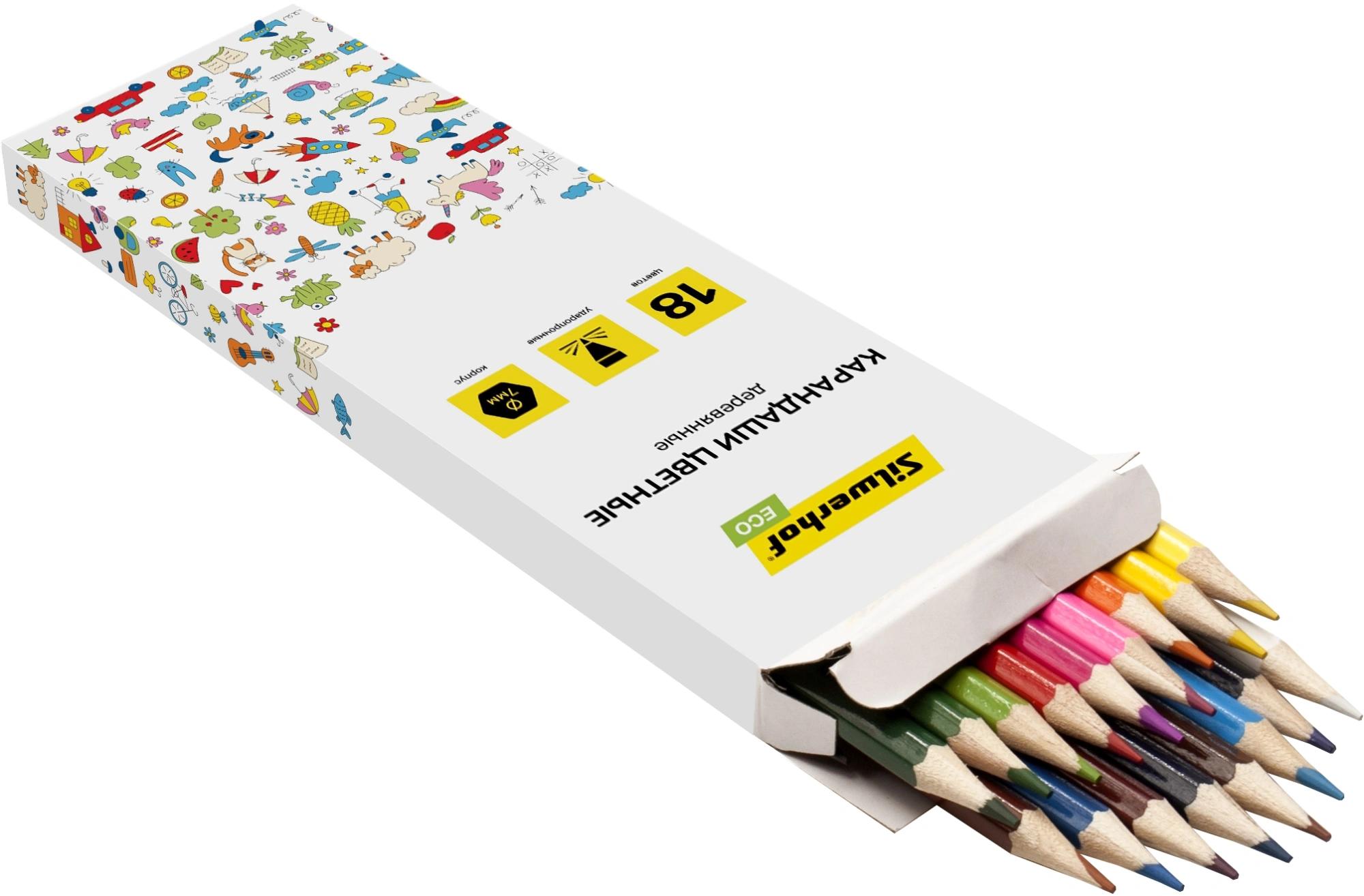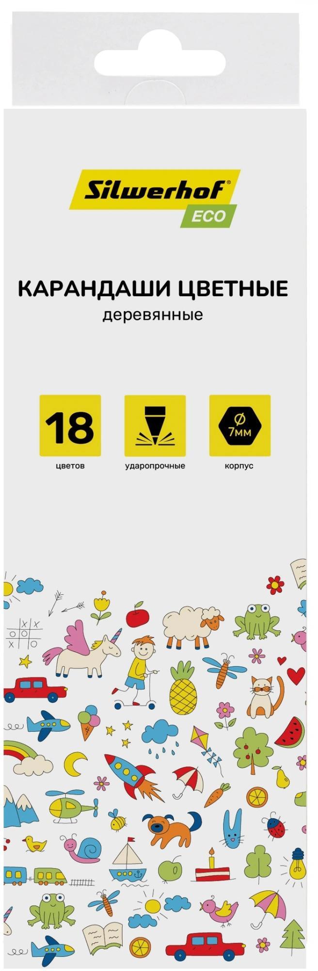 | | Карандаши 18 цветов (шестигранный корпус) SILWERHOF Eco (заточенные) (картонная упаковка с европодвесом)  Цветные карандаши - прекрасный выбор для детского творчества. Занятие рисованием развивает мелкую моторику, стимулируя участки мозга, отвечающие за мышление, речь, зрительную и двигательную память, а также координацию. Рисование развивает пространственный интеллект, творческое мышление, фантазию и воображение малыша. В качестве результата своего труда ребенок получает реальный результат - рисунок, что учит его целеполаганию и формирует ориентацию на результативную деятельность. Прекрасно подходит для занятий рисованием в детском саду, кружках, в школе и дома. Рекомендовано детям от 3-х лет. |