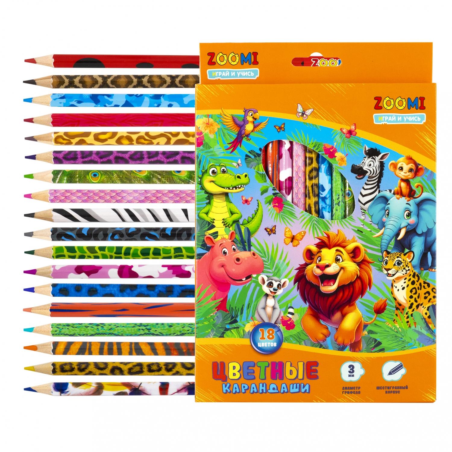 | | Карандаши 18 цветов (шестигранный корпус) ZOOMI Zoo Джунгли (заточенные) (картонная упаковка с европодвесом)  Карандаши цветные ZOOMI 18 цв., "ZOO. Джунгли" деревянные, шестигранные, заточенные, дизайн на корпусе, грифель 3.0 мм, картон. уп., европодвес |