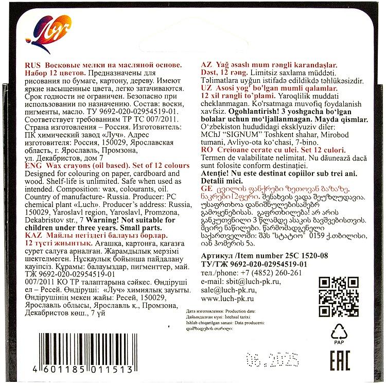 | Мелки (карандашики) цветные восковые 12 цветов (круглый корпус) ЛУЧ Фантазия на масл осн (картонная упаковка с европодвесом) Ассорти  Мелки изготовлены на основе восков с добавлением масла, вследствие чего рисуют мягко, хорошо укрывая поверхность. Имеют яркие, насыщенные цвета. Мелок толще обычного деревянного карандаша, его удобно держать маленьким, не привыкшим к карандашам ручкам Мелки очень мягкие. Ребенку не нужно сильно нажимать, чтобы появилась линия Рисуют по бумаге, картону, дереву, камням и другим поверхностям Прекрасно рисуют в различных техниках в сочетании с акварелью, гуашью и т.д Легко скользят по поверхности, оставляя яркие линии и штрихи Цвета очень яркие, насыщенные Каждый мелок завернут в бумажную этикетку. Это снижает скольжение мелка в руке, улучшает прочность мелка, предохраняет от загрязнений всего вокруг Безопасны для детей (безопасность продукции гарантируют регулярные проверки на соответствие требованиям по безопасности Российского законодательства, требованиям Таможенного союза и требованиям по безопасности гармонизированных стандартов ЕС) Количество цветов: 12 |