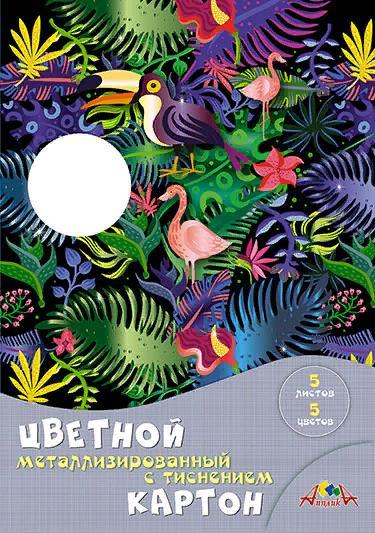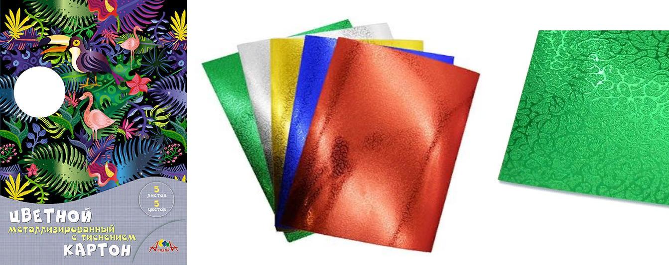 | | Картон цветной металлизированный с тиснением односторонний 5 листов 5 цветов А4 (АППЛИКА) в папке Бл троп (плотность 230г/кв м)  Цветной металлизированный картон с тиснением 5 листов, 5 цветов ТМ Апплика. Листы картона с нанесением металлизированной пленки, с последующим тиснением цветочного узора. В наборе цвета: золотой, серебрянный, красный, зеленый, синий. Металлизированный картон на бумажной основе хорошо режется ножницами и отлично клеится. Широко применяется в детском творчестве для поделок и аппликаций. Упаковка - папка выполнена из мелованного каритона. Рекомендован для детей от 3-х лет. |