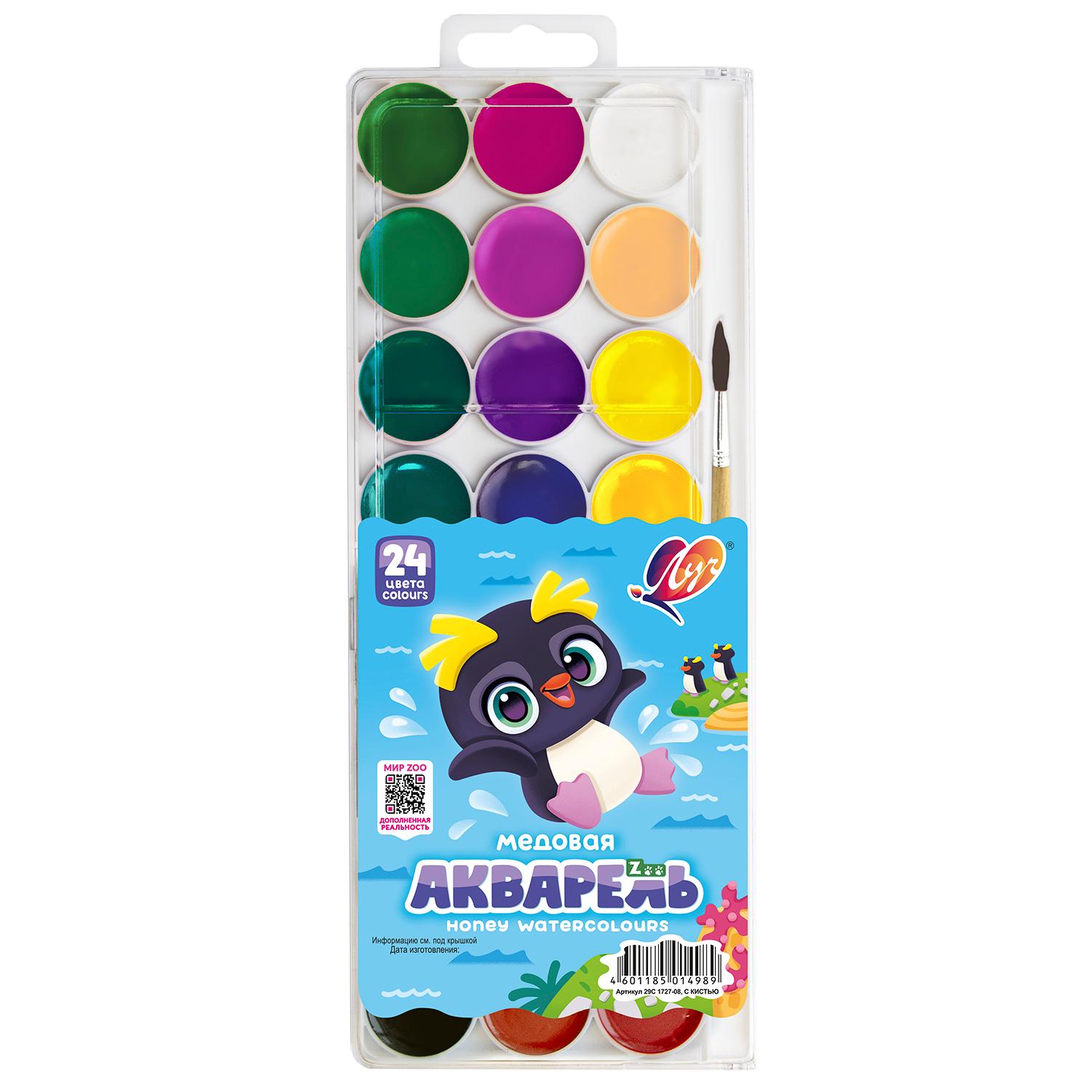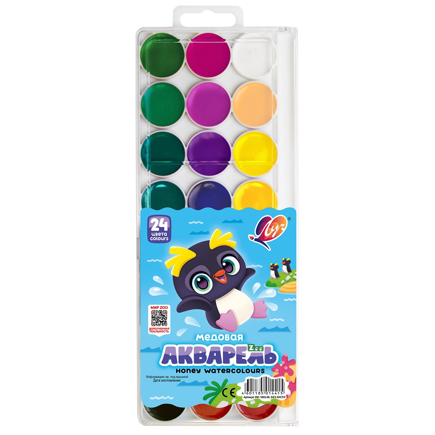| | Краски акварельные медовые 24 цвета ЛУЧ Zoo (без кисточки) (п/упаковка с европодвесом)  Акварельные медовые краски "ЗОО" - высококачественная краска для детского творчества, изготовленная по классической рецептуре с использованием мёда. Акварельные краски имеют яркие, чистые цвета, прозрачную основу при нанесении, без вкраплений. Краски легко смешиваются между собой, сохраняя насыщенность цвета, смываются без труда с рук. Краски поставляются в пластиковой упаковке с выемкой для кисточки. Кисточка в комплект не входит. Срок годности не ограничен. |
