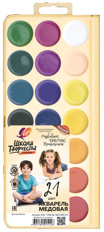 Краски акварельные медовые 21 цвет ЛУЧ Школа творчества (без кисточки) (п/упаковка с европодвесом)  Акварель "Школа творчества" - высококачественная краска для детского творчества, изготовленная по классической рецептуре. Удобные кюветы классической формы Традиционно высокое качество акварели Удобное расположение цветов краски группами: холодные-тёплые оттенки В акварели есть мёд, что значительно улучшает её качество и внешний вид Безопасна для детей (безопасность продукции гарантируют регулярные проверки на соответствие требованиям по безопасности Российского законодательства, требованиям Таможенного союза) Яркие, чистые цвета Прозрачная основа при нанесении, без вкраплений Прекрасно размывается и разносится по поверхности бумаги Легко наполняется на кисть Краски смешиваются между собой, сохраняя насыщенность цвета Большое количество краски в кюветах Краска легко смывается с рук и одежды Срок годности не ограничен |