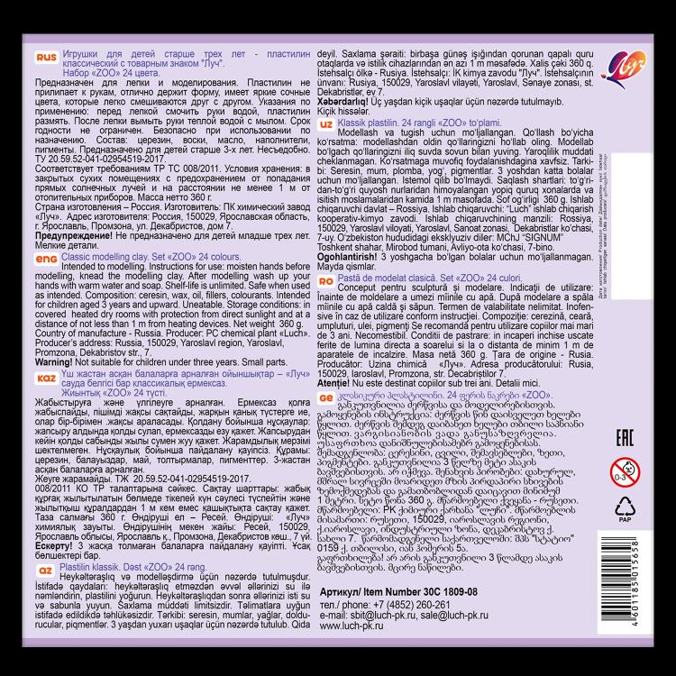| | Пластилин 24 цвета 360гр ЛУЧ Zoo (картонная упаковка)  Пластилин «Zoo» предназначен для лепки и моделирования в детском творчестве. Яркий и пластичный пластилин изготовлен из высококачественных компонентов. В меру мягкой и в меру твёрдой. Является отличным материалом для обучения лепке Пластилин рекомендуют не только педагоги и родители, но и профессиональные мультипликаторы Не имеет выраженного неприятного запаха Имеет яркие, не приглушённые чистые цвета, которые отлично смешивающиеся друг с другом Отлично держит форму, не рвётся и не крошится при перегибании Не липнет к рукам Идеально вытягивается до тончайшей колбаски Можно делать очень маленькие детали, которые не деформируются при соединении Безопасен для детей (безопасность продукции гарантируют регулярные проверки на соответствие требованиям по безопасности Российского законодательства, требованиям Таможенного союза и требованиям по безопасности гармонизированных стандартов ЕС |