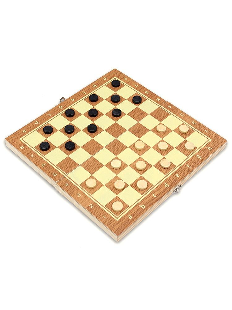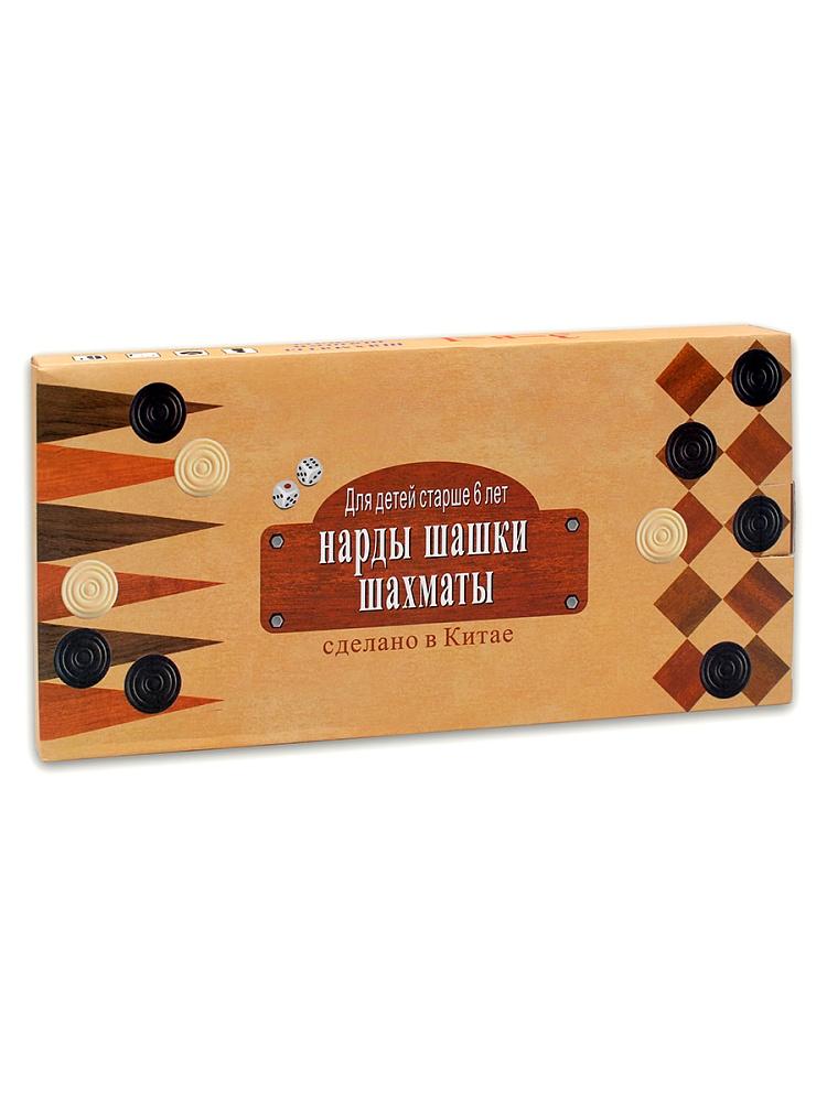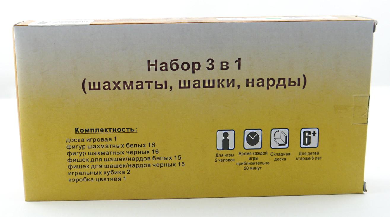 | Игра настольная Шахматы+шашки+нарды 3 в 1 ДК 34*34см (картонная упаковка)   О товаре Шашки, нарды, шахматы 3в1 – это набор красиво оформленных классических настольных игр для вашего ребенка. Набор состоит из двухстороннего игрового поля: одна сторона поля предназначена для игры в шахматы и шашки, вторая – для игры в нарды. Края у игрового поля скруглены, и оно легко складывается пополам. Благодаря небольшому размеру и весу набора, его можно брать с собой, отправляясь в путешествие. Помимо классических шахмат, игровое поле также позволяет играть в самые различные варианты шашек: бразильские шашки, поддавки, чекерс, русские шашки, пул, итальянские шашки. Описание правил к данным видам игр читайте на обратной стороне коробки. Правила игры в нарды находятся внутри коробки. Набор 3в1 «Шашки, нарды, шахматы» скрасит досуг вашего ребенка весельем и удовольствием, а также будет способствовать развитию образного мышления, комбинаторики, памяти, внимательности, логического мышления и способности мысленно просчитывать свои шаги на много ходов вперёд. Состав игры: - двухстороннее игровое поле из картона – 1 шт. (42 х 32,5 см)
