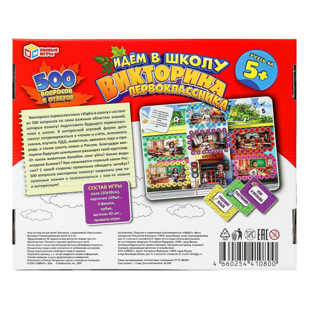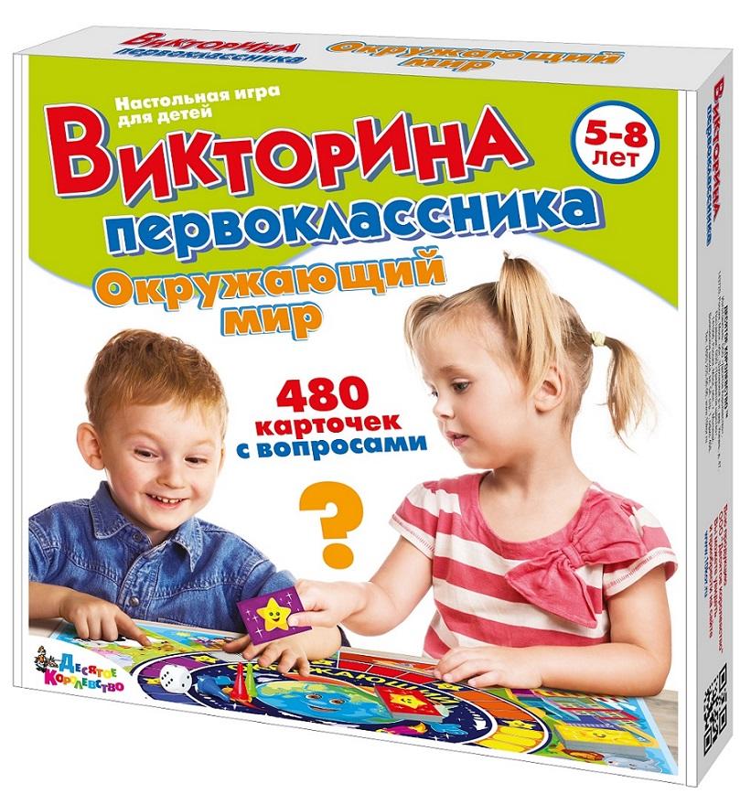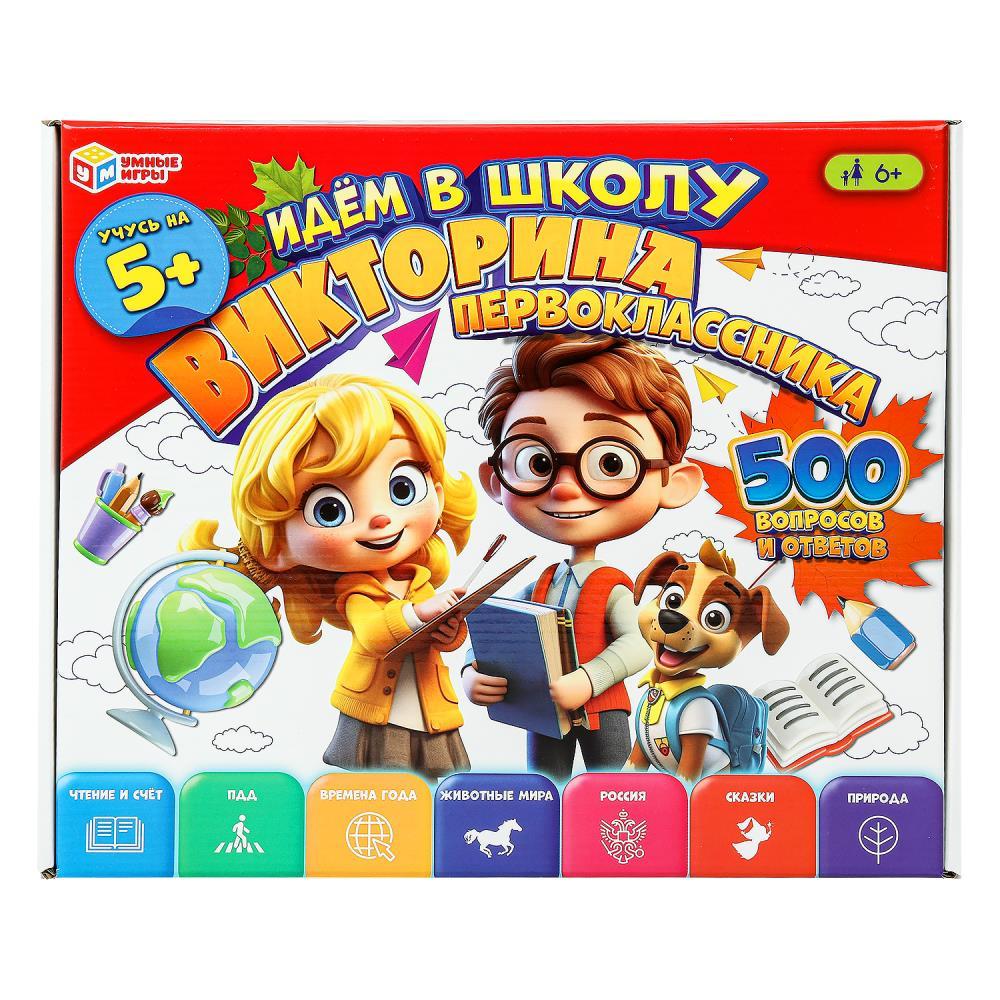 | Игра настольная Викторина (РУССКИЙ СТИЛЬ) Будущего первоклассника 5в1 (картонная упаковка)   Эта развивающая викторина поможет в занимательной игровой форме проверить знания будущего первоклассника по математике, окружающему миру, русскому языку, правилам поведения и безопасности, и выяснить, нет ли в них пробелов, которые необходимо восполнить. Играя, дети повторят такие важные темы, как порядковый счёт, цифры, числа, сложение и вычитание, сравнение чисел, геометрические фигуры и формы, буквы, слоги, предлоги, обобщающие слова, живая и неживая природа, растения и животные, календарные месяцы, правила безопасности, правила дорожного движения, правила поведения в школе и по дороге к школе, повторят важную тему «Наша Родина» и многое другое, что необходимо знать к первому классу. Эта игра будет отличным подарком будущему первокласснику! В комплект игры входит игровое поле, 400 карточек с вопросами, 4 фишки, кубик и правила. Игра рассчитана на 2-4 игроков или 2-4 команды и предназначена для детей в возрасте от 5 до 7 лет. Два варианта игры позволяют эффективно использовать её как дома, так и в дошкольных учреждениях.  |