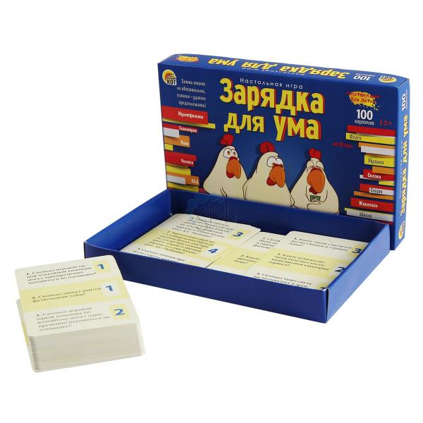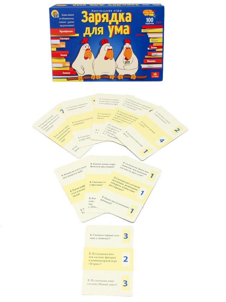 | Игра настольная Викторина (РЫЖИЙ КОТ) Зарядка для ума 100 карточек (картонная упаковка)  "Зарядка для ума" придется по вкусу как большой компании, так и парочке друзей. Пробелы в знаниях не станут помехой для приобщения к этой игре, ведь здесь вовсе не обязательно знать точные ответы, главное, предположить, догадаться, что же может скрываться в ответе. И если Ваш ответ будет максимально близким к отгадке, то именно Вы и получите победные баллы, которые запросто приведут Вас к оглушительному триумфу! Игра предназначена для 2 и более игроков. Произведено в России. Возрастное ограничение: 3+. |