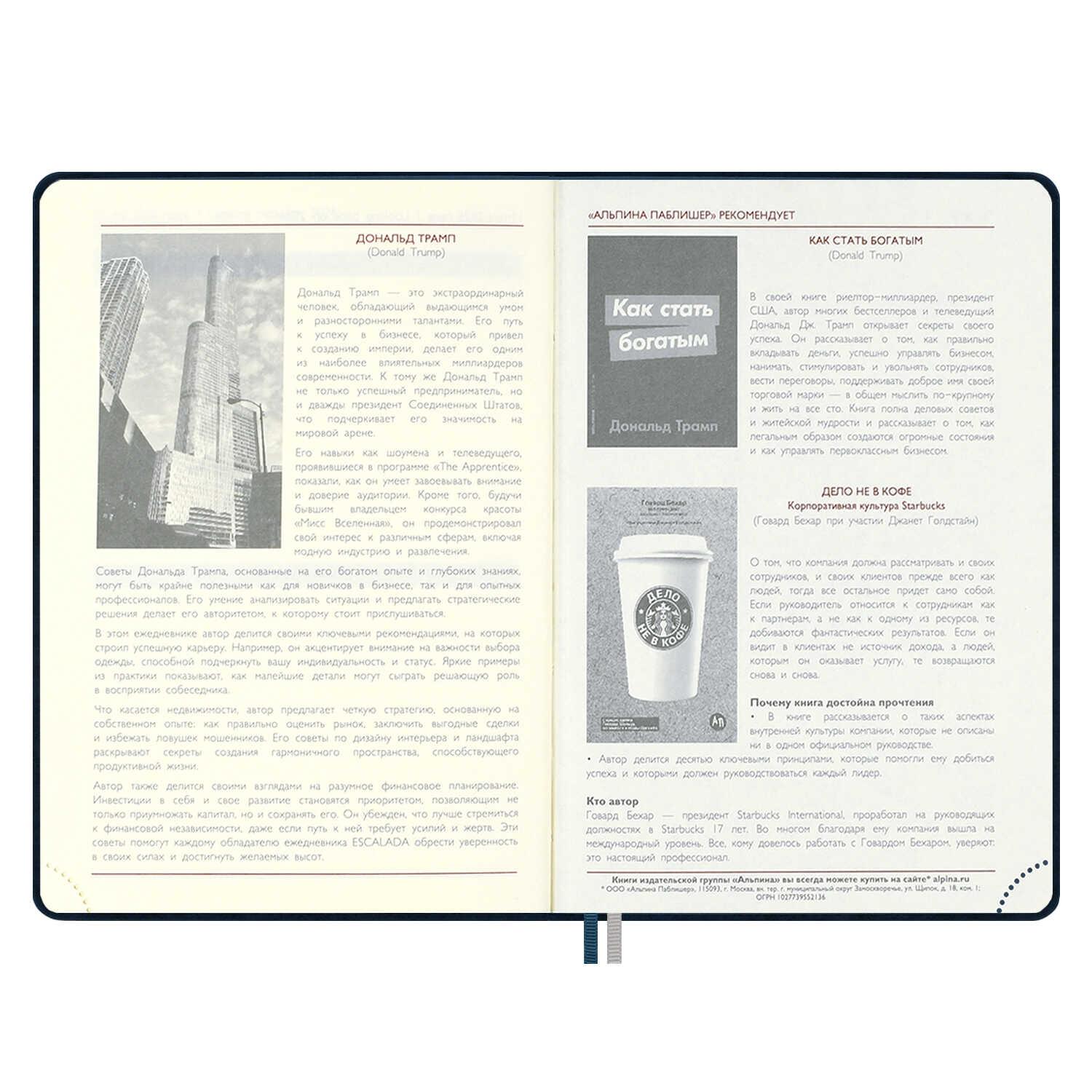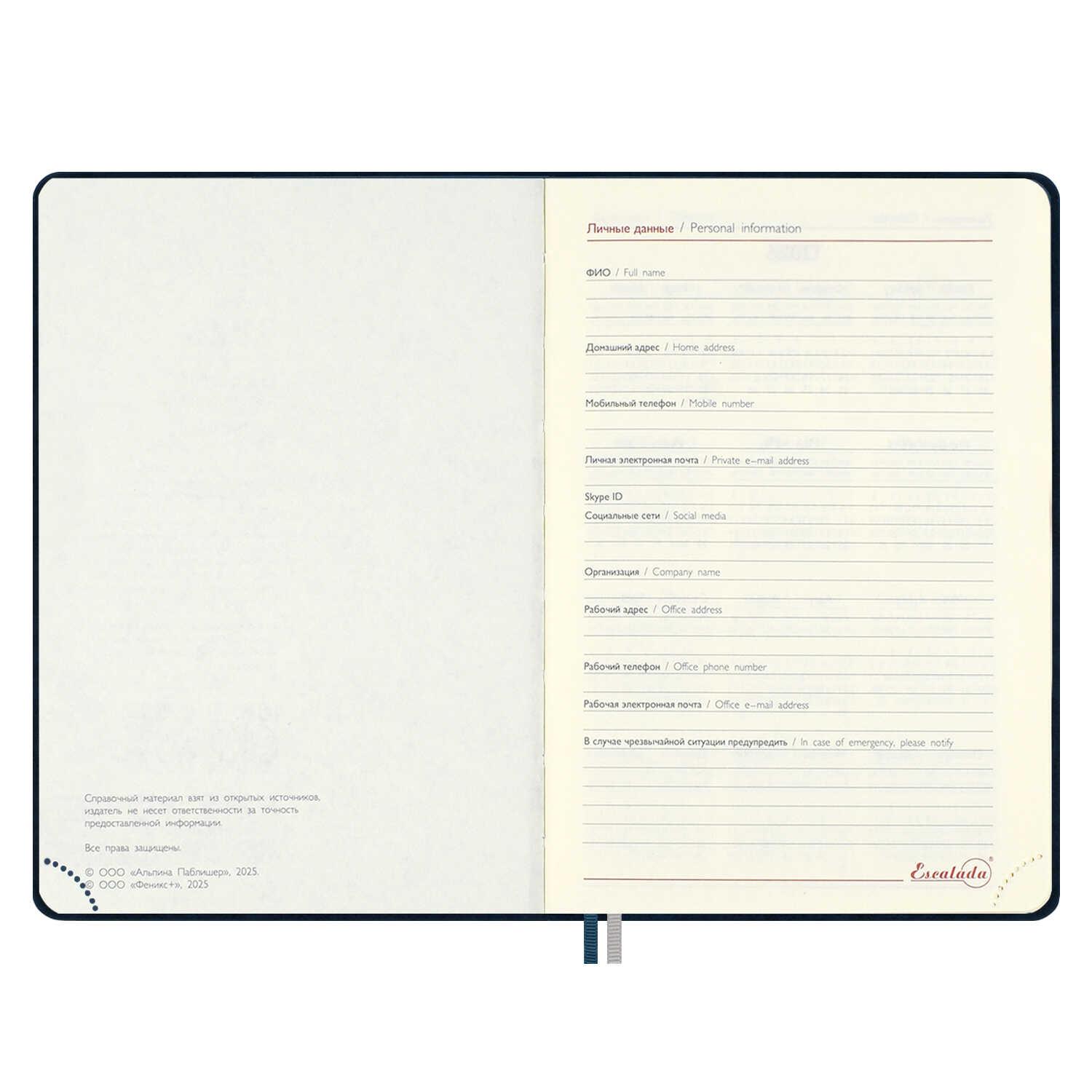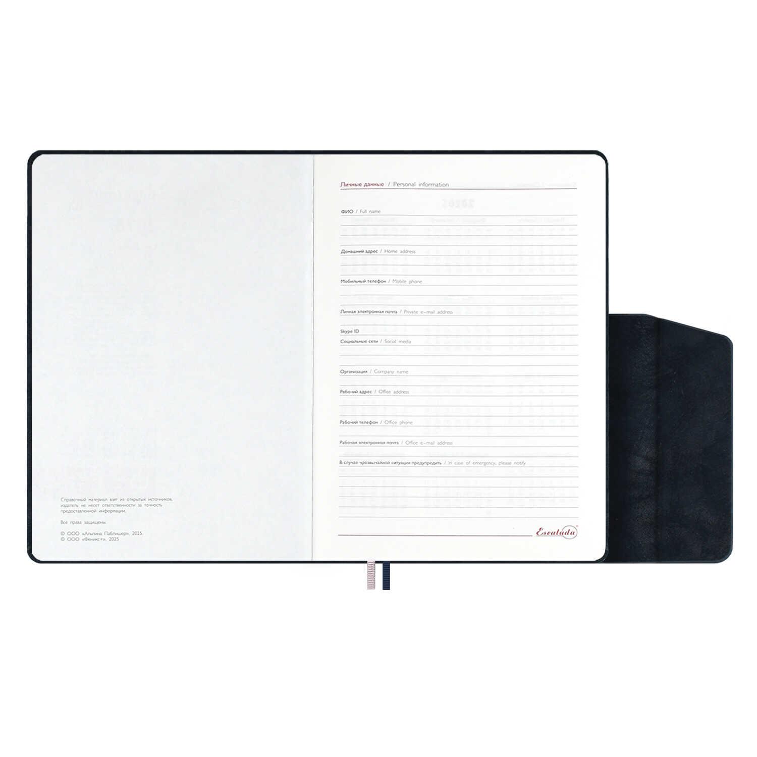 | Ежедневник датированный на 2026год А5 кожзам (линейка) ( 352 страницы) (ФЕНИКС) (твердая обложка) ТивГл Думай син (п/упаковка)  Ежедневник датированный 2026 ESCALADA, #ДУМАЙ КАК МИЛЛИАРДЕР, А5, 176 л., арт. 70255/ 15 ТИВОЛИ ГЛОСС СИНИЙ (кожзам: 146x211 мм, твёрдый переплёт, материал обложки: искусственная кожа "Тиволи глосс"; декор: блинтовое тиснение; способ крепления блока: ниткошвейный; вн. блок: 176 л., кремовый офсет 70 г/м?, печать в две краски (линия), справочный материал: есть; перфорация углов блока: нет; отделка среза: окрашивание пантоном; закладка/-и: два ляссе; каптал: есть; форзац: печать пантоном; особенности: в блоке использованы мотивирующие высказывания из книги "Думай как миллиардер", помогающие сформировать правильное отношение к финансам, профессиональной деятельности, своим способностям и к жизни в целом, магнитный клапан; персонализация возможна: да; индивидуальная упаковка: промостикер + ПЭТ-пакет) |