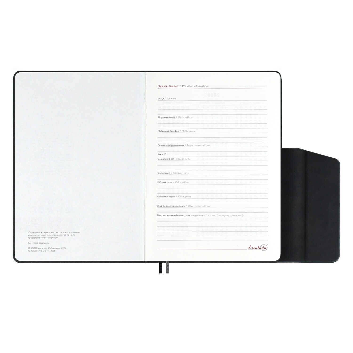 | | Ежедневник датированный на 2026год А5 кожзам (линейка) ( 352 страницы) (ФЕНИКС) (твердая обложка) Тиволи Думай чер (п/упаковка)  Ежедневник датированный 2026 ESCALADA, #ДУМАЙ КАК МИЛЛИАРДЕР, А5, 176 л., ТИВОЛИ ЧЁРНЫЙ (кожзам: 146x211 мм, твёрдый переплёт, материал обложки: искусственная кожа "Тиволи"; декор: блинтовое тиснение; способ крепления блока: ниткошвейный; вн. блок: 176 л., кремовый офсет 70 г/м?, печать в две краски (линия), справочный материал: есть; перфорация углов блока: нет; отделка среза: окрашивание пантоном; закладка/-и: два ляссе; каптал: есть; форзац: печать пантоном; особенности: в блоке использованы мотивирующие высказывания из книги "Думай как миллиардер", помогающие сформировать правильное отношение к финансам, профессиональной деятельности, своим способностям и к жизни в целом, магнитный клапан; персонализация возможна: да; индивидуальная упаковка: промостикер + ПЭТ-пакет) |