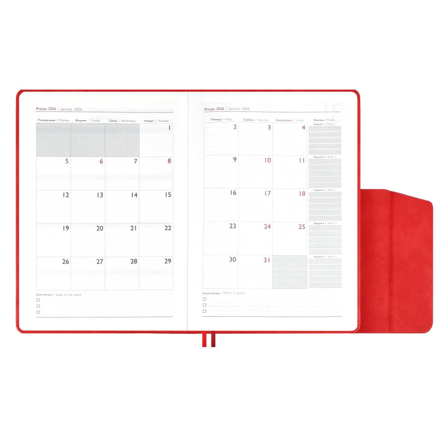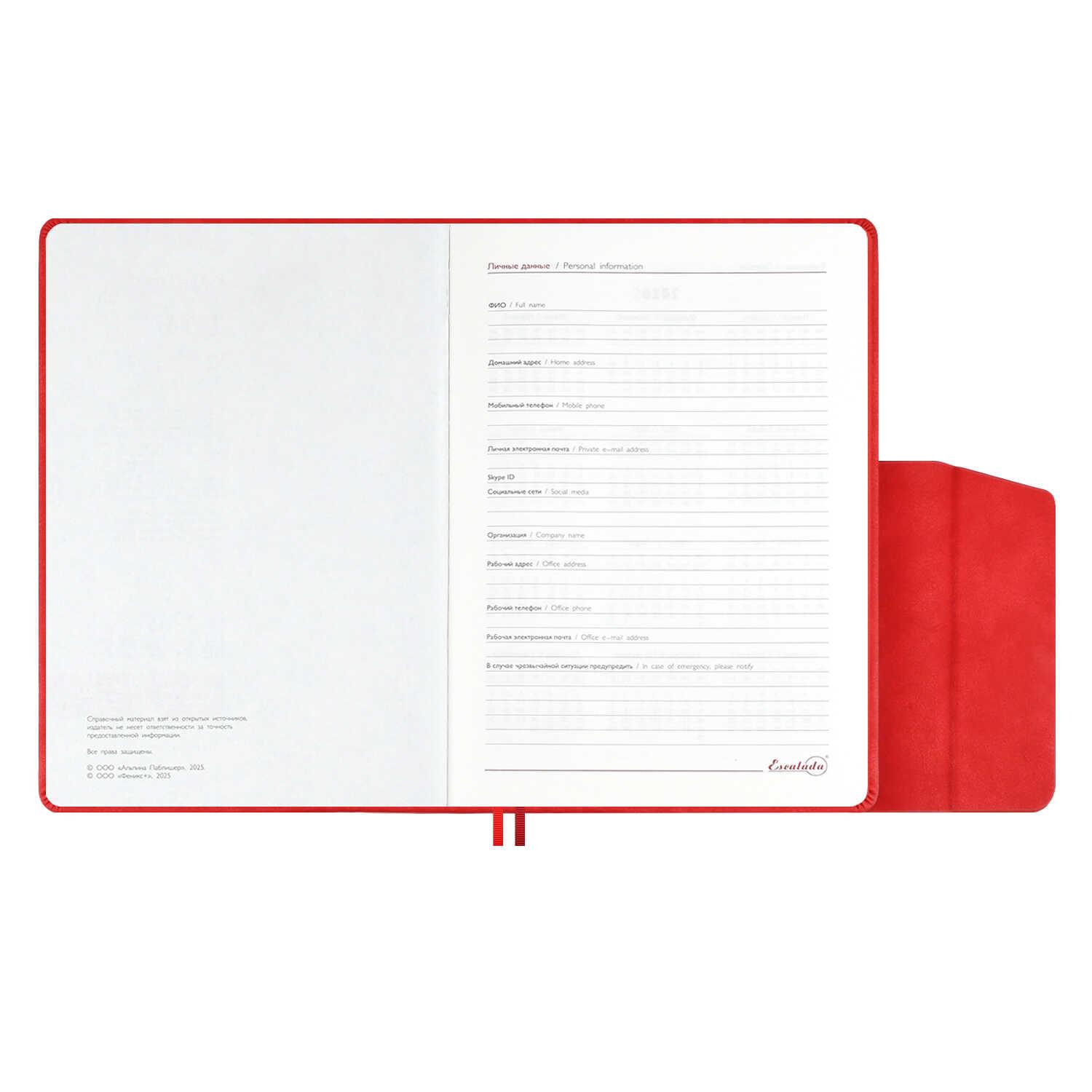 | Ежедневник датированный на 2026год А5 кожзам (линейка) ( 352 страницы) (ФЕНИКС) (твердая обложка) Тиволи Думай крас (п/упаковка)  Ежедневник датированный 2026 ESCALADA, #ДУМАЙ КАК МИЛЛИАРДЕР, А5, 176 л., ТИВОЛИ КРАСНЫЙ (кожзам: 146x211 мм, твёрдый переплёт, материал обложки: искусственная кожа "Тиволи"; декор: блинтовое тиснение; способ крепления блока: ниткошвейный; вн. блок: 176 л., кремовый офсет 70 г/м?, печать в две краски (линия), справочный материал: есть; перфорация углов блока: нет; отделка среза: окрашивание пантоном; закладка/-и: два ляссе; каптал: есть; форзац: печать пантоном; особенности: в блоке использованы мотивирующие высказывания из книги "Думай как миллиардер", помогающие сформировать правильное отношение к финансам, профессиональной деятельности, своим способностям и к жизни в целом, магнитный клапан; персонализация возможна: да; индивидуальная упаковка: промостикер + ПЭТ-пакет) |